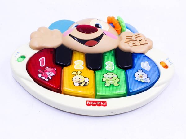А за сядането - той не иска да седи легнал и само мрънка. Като го сложа легнал се обръща по два начина - или по корем и после в опитите да лази се избутва назад, или започва да се търкаля корем, гръб, корем и стига до ръба. Много е палав, дори като го държа в мен само се извива, опъва, изобщо не може да седи мирен. Като го хвана под мишниците и го сложа да стъпи на краката ми, започва да се избутва и да подскача. За момента като игри ползваме дрънкалки, плюшени играчки от тия дето се дърпа връвчица и пеят мелодия, книжка с животни, на която и той много се кефи и най-голямата занимавка ни е едно кученце пиано на фишър прайз, което го имам още от другите деца и сега го търсих и не успях да го намеря по магазинитв. То има 4 бутона за натискане  и носа също му се натиска. Има 3 режима на работа, може да свири, пее песнички, казва животни и какви звуци издават, казва цветове, свети в различен цвят - общо взето е страхотно. Слагам го седнал в леглото му, обикалям го с възглавницата за бременни, за да има някаква опора и му го слагам отпред да си натиска бутончета, гледа цветове и да се занимава. Ето това е играчката, която му е любима: