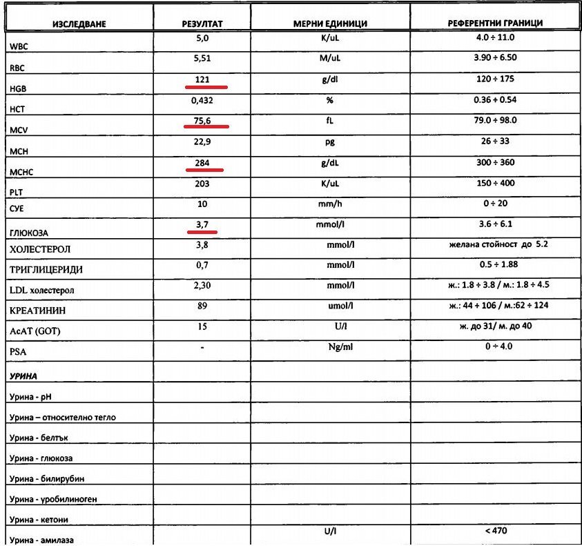 Желязото е една единица под долна граница, но не мисля, че е проблем. Всички други кръвни, урина,биохимия,хемоглобин, холестерол,електролити,калций, фосфор са в норма.
