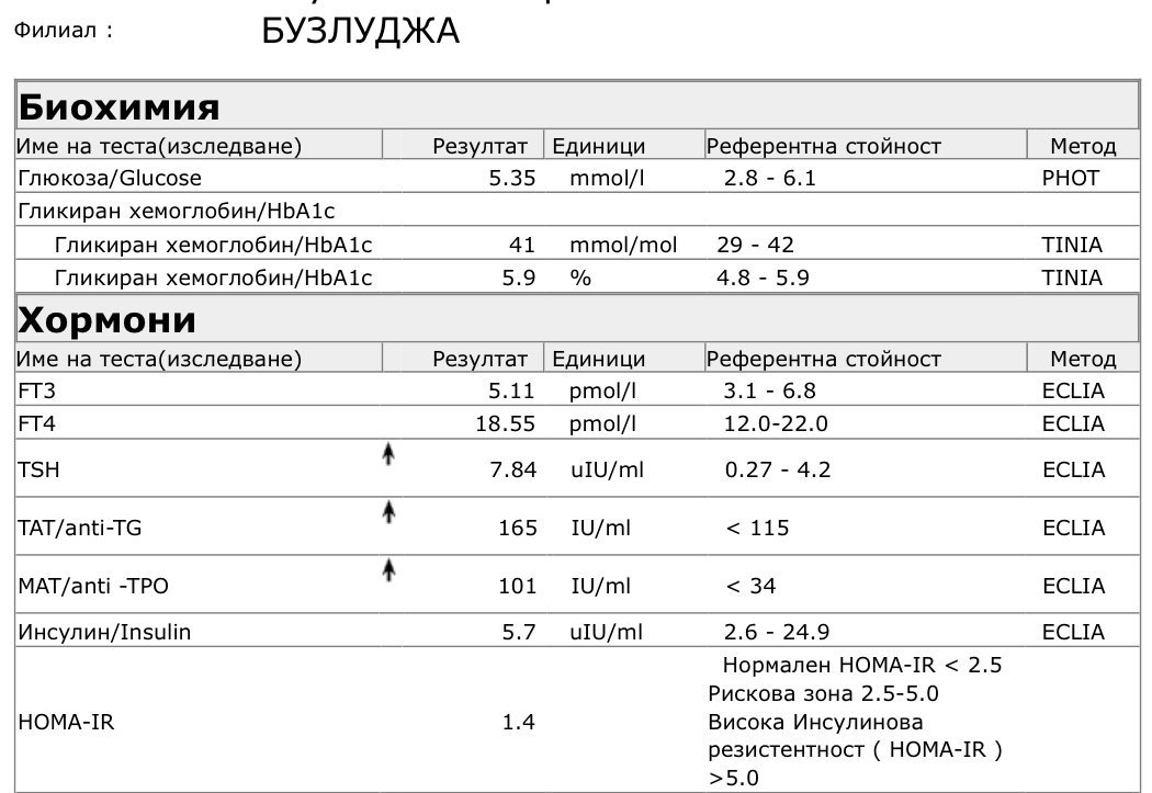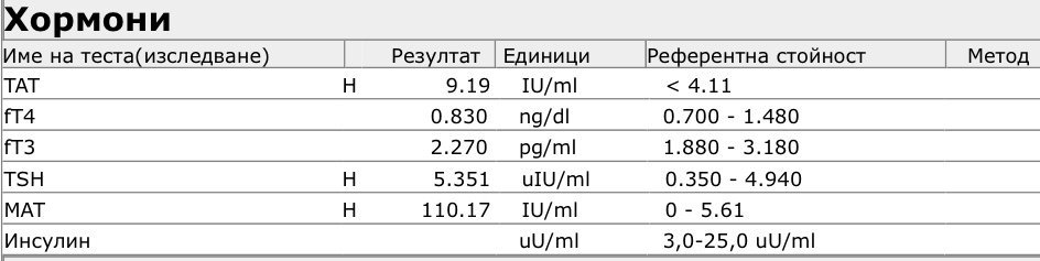 Момичета, помагайте! Днес със свито сърце реших да си пусна нови изследвания в Кандиларов. Правих предишните преди диетата на Изабела на 30.01., два месеца по-късно пуснах едни в Рамус, които тотално ме озадачиха, защото изглеждаха доста по-лоши, но ТСХ беше и при двата теста 5,94 и в Рамус 5,35. Сега ТСХ направо е литнало:(, но пък антителата са спаднали доста - и ТАТ и МАТ