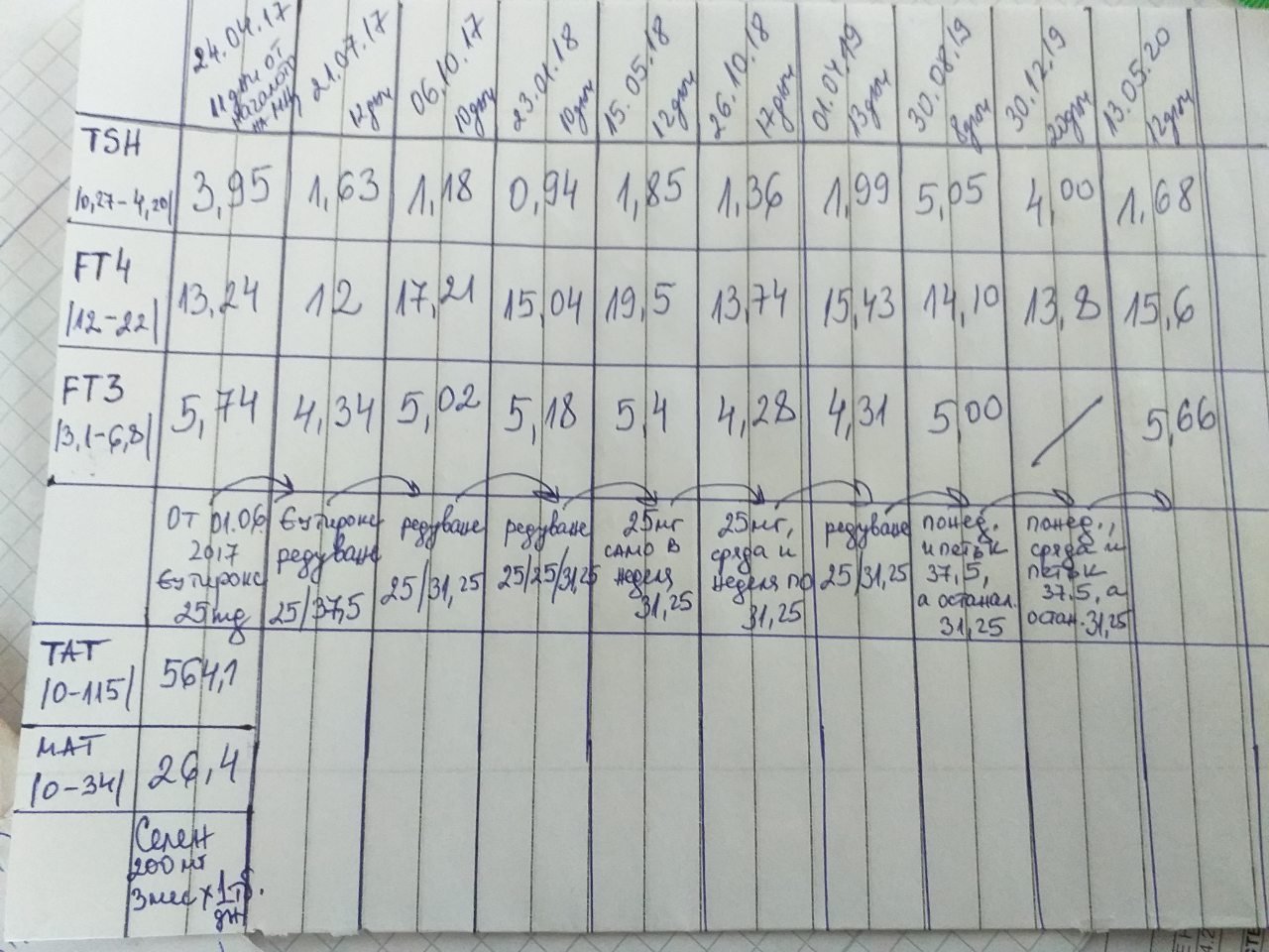 Да, следя и другите, не само ТСХ. Ето ми таблицата с изследванията и дозите на еутирокса.