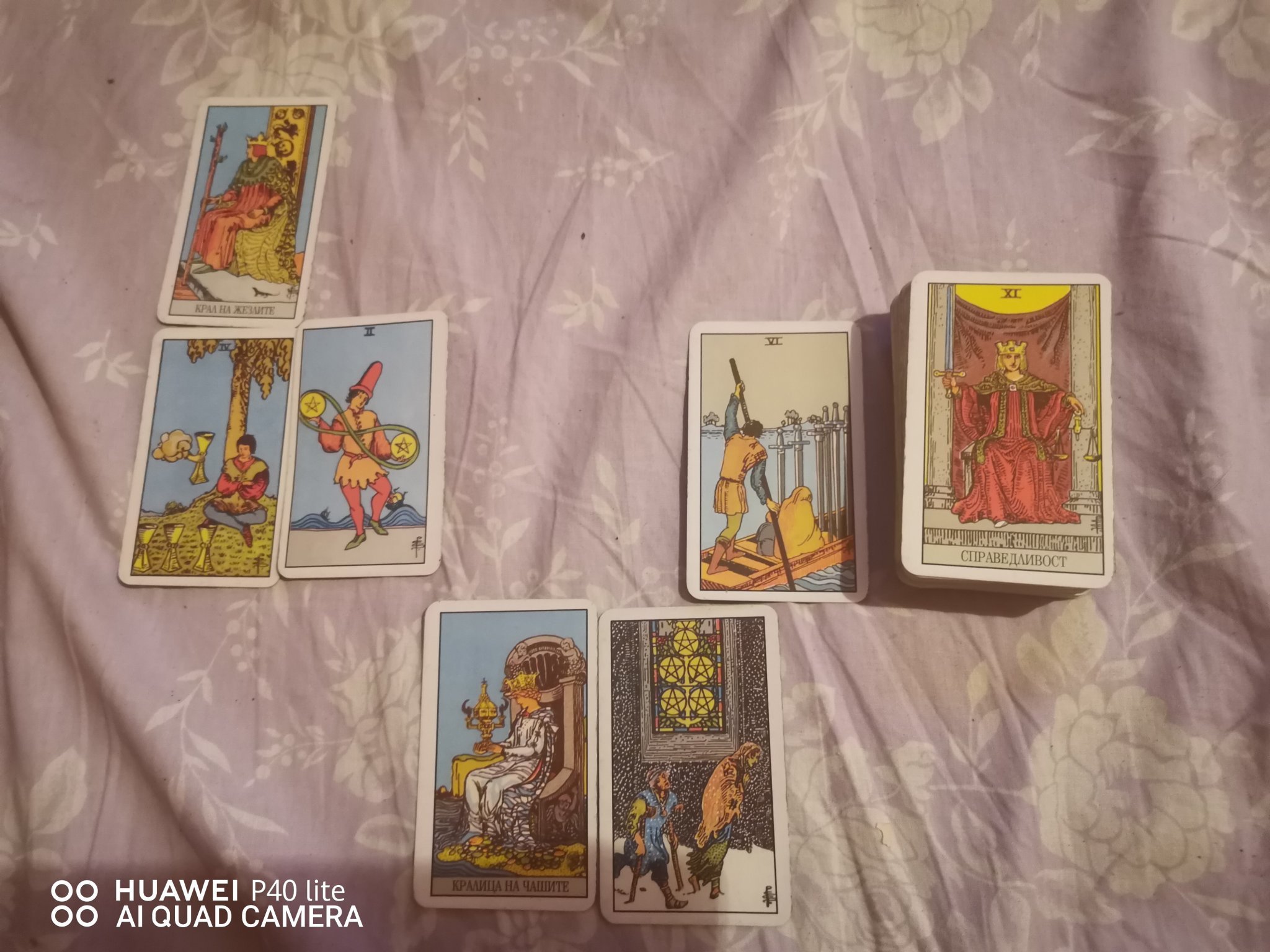 Какво виждате вие по тези карти.... Въпросът е какъв ще е изхода от ситуацията след разрива на личните отношения? КЖ изпадна пръв, после изтеглих 4Ч,2П, изпаднаха КЧ и 5П,посследна изтеглих 6М,отдолу Справедливостта.