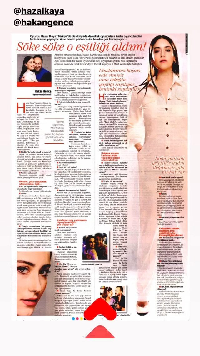 Хазал призналась, что никогда не подвергалась сексуальным домогательства в шоу-бизнесе, но она страдала от дискриминации. Например, если актер опаздывает на съемки, все принимают это как должное. Если опаздывает актриса - это повод для продюсера позвонить ее менеджеру и устроить скандал. Или как пример - новости о том, что Чагатай Улусой и она подписали контракт с агентством United Talent Agency. Огромные статьи о международном успехе Чагатая и крошечная заметка о том, что она тоже подписала контракт. Турецкие СМИ решили, что весь успех у мужчины, и не обратили внимание на то, что контракт они подписали вместе.