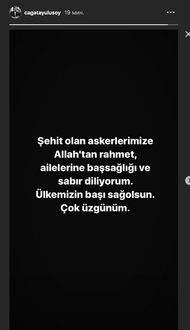 [quoteСегодня практически все звезды турецкого экрана выражают свои соболезнования по поводу гибели 33-х турецких военнослужащих в Сирии. Не остался в стороне и Чагатай Улусой, который выложил соболезнования в Фейсбуке, Твиттере и Инстаграме][/quote]
