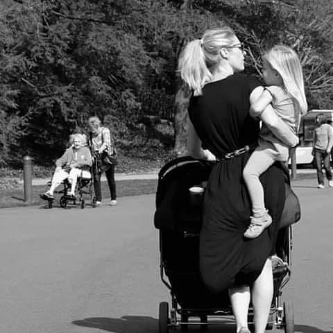 "Собственикът на снимката каза: Скитах се из градините на Лонгууд, и тази майка понечи да носи момиченцето си и да дърпа бебешката количка, така че реших, че ще направя снимка с нея и всъщност тя го направи. Когато проверих изображението на камерата, открих, че съм направил снимка на сцена, която обобщава човешкия жизнен цикъл !! От другата страна на пътя се появява жена, докато бута инвалидната количка на възрастната си майка. Това беше като пресечната точка на два живота: майка, която носеше дъщеря си, и дъщеря, която дърпаше количката на майка си."