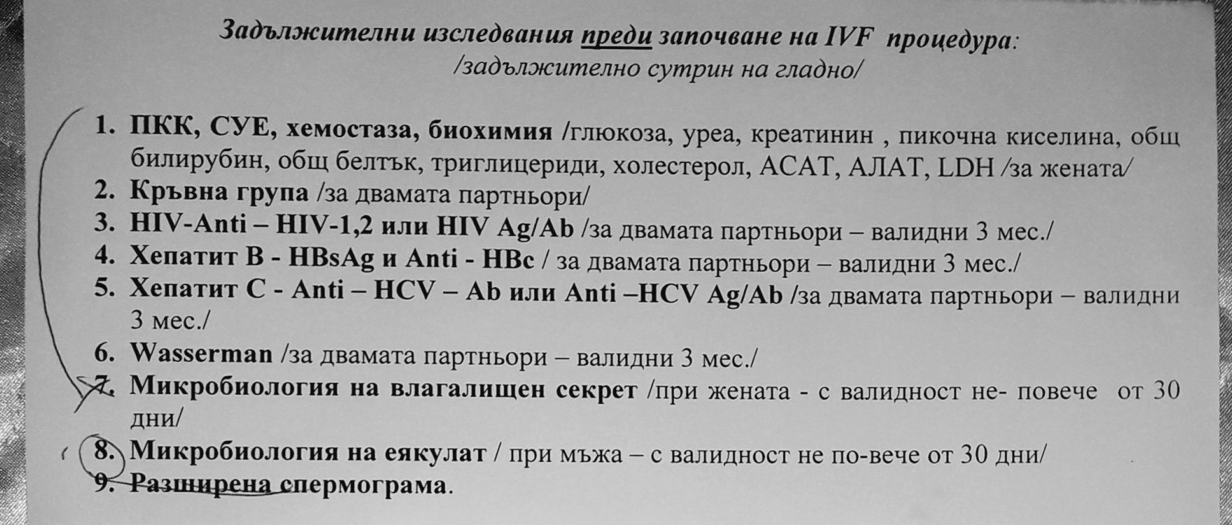 Здравейте момичета, да попитам Simple Smile  Дали случайно някоя от вас има листчето, което дават със задължителните изследванията преди започване на ин витро?