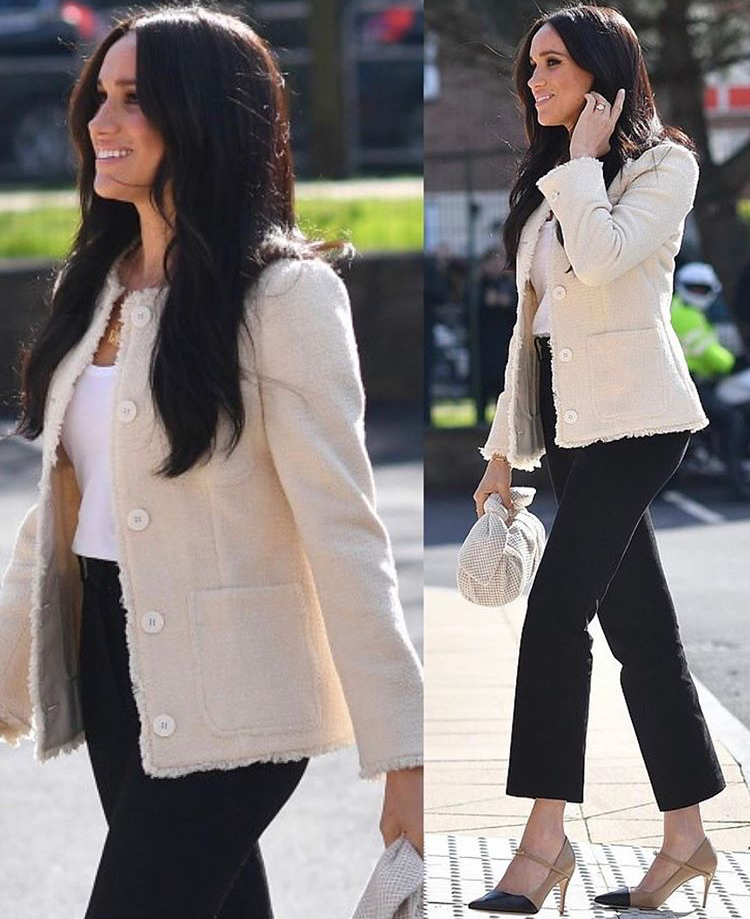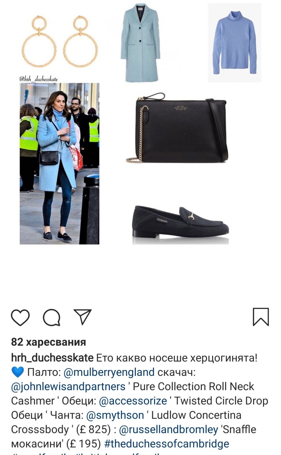 Аутфита на Кейт от днес с цени. Само обувките не са ми по вкуса. Другото е супер. Много рядко можем да я видим с такъв цвят дънки но много ми харесва.