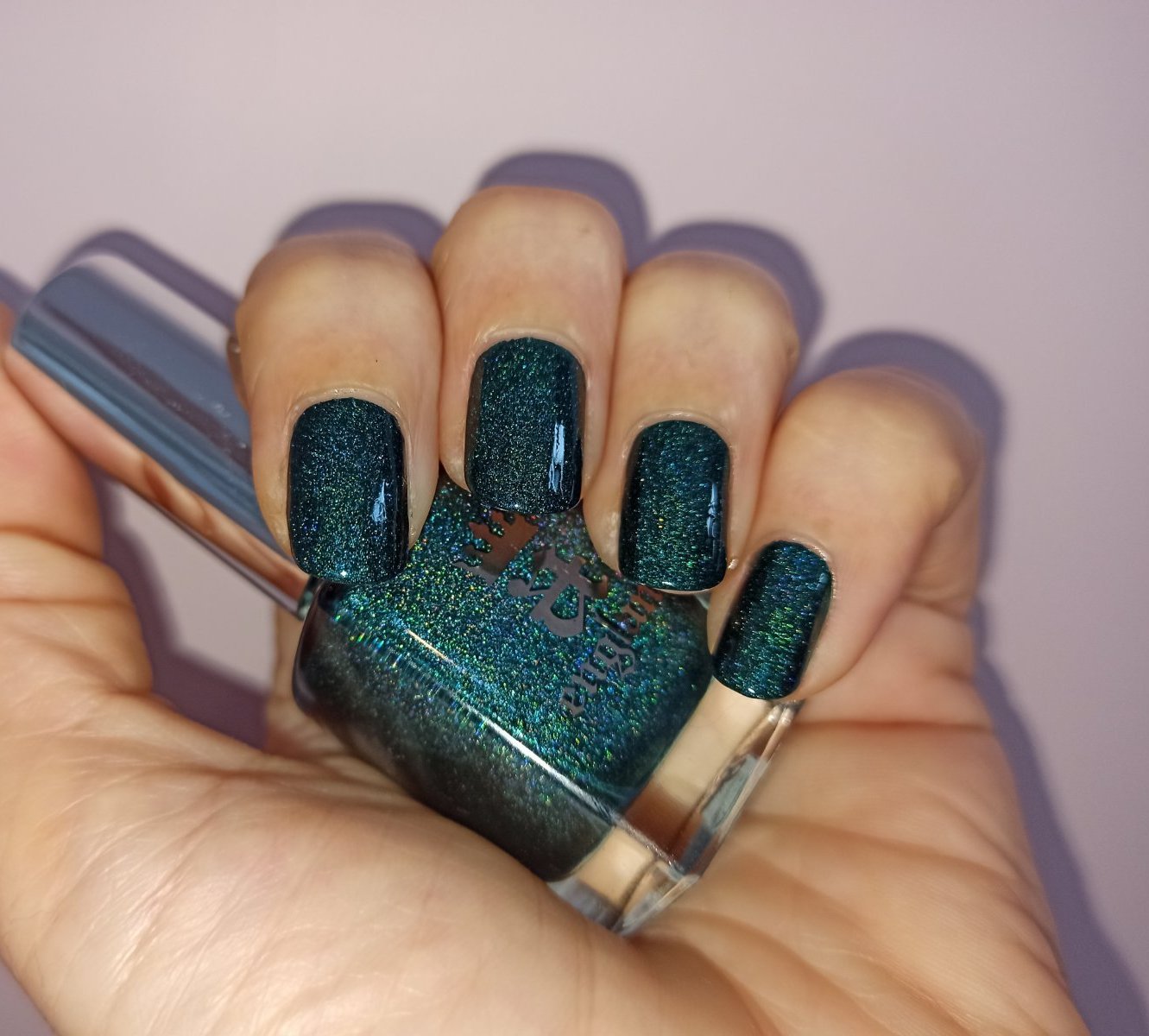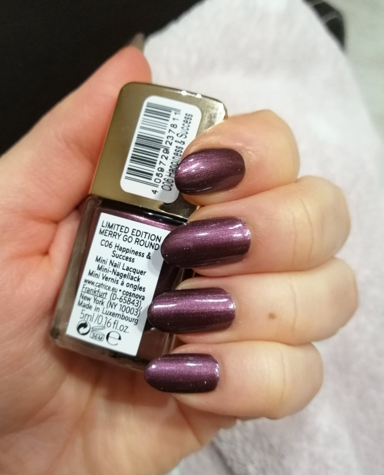 Аз от 3 дни съм с друг Катрис от коледния сет и отново съм впечатлена. Много интересен кафяв мауви цвят с лека патладжанена нотка и още по-готиното е холограмния прашец в дълбочина. Blush
