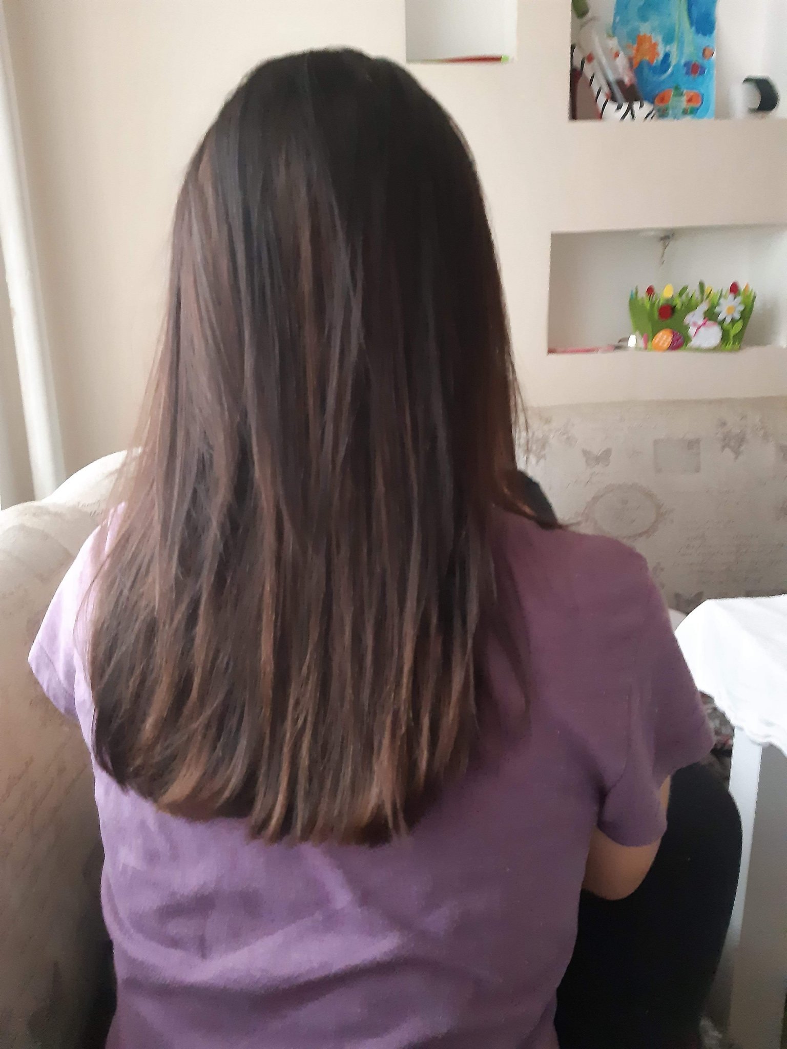 Дъщеря ми ме снима за да ми покаже,че съм имала кичури в косата.Кичурите са от неуспешното мърдане на цвета с олио преди два месеца .