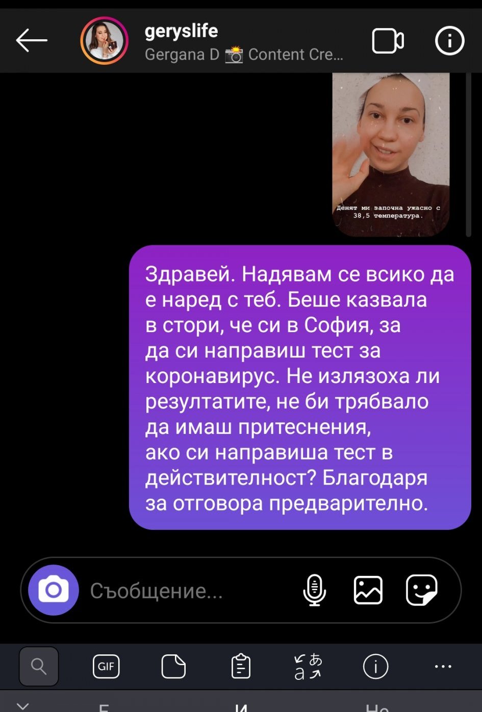 Тестовете не се правят по желание, особено към онзи момент никой не я тествал, лъже и маже. Освен това в ранен етап на заразяването тестът може да не покаже нищо. Но и тя, и простата й сестра не се спряха.  Най-лошото беше, че съм 100% сигурна, че е ходила и в Британика на курсове. Имаше май сторита. Ако касаеше само нея, да си троши главата, но ако сега е болна и е заразила още хора , няма да казвам какво заслужава, че ще ме баннат.