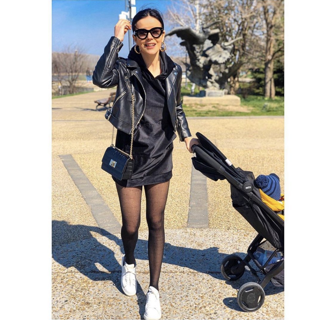 Нещо като дълъг суитчър /не е и рокля според мен/, който едва ѝ покрива Д-то и черен мрежест чорапогащник... представих си я как тича и се навежда по малкия така спретната на площадката 😁