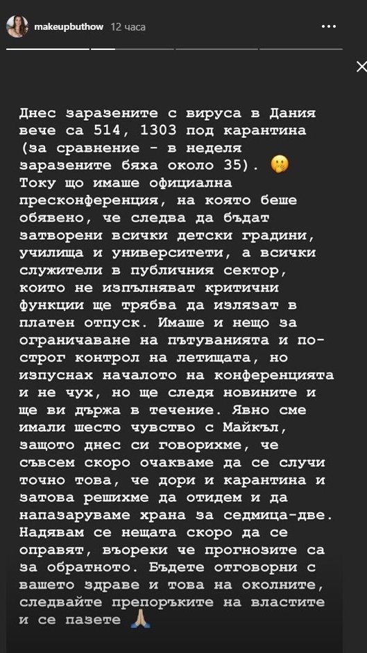 За мен включването на Елица по темата не е спам, просто уведоми какво са казали по тяхната ТВ (че Дания е под карантина от понеделник), че тя и Майкъл са решили да напазаруват за 2 седмици още във вторник и сподели какво е купила в стори. Другите не ги следя какво са се изказали за вируса.