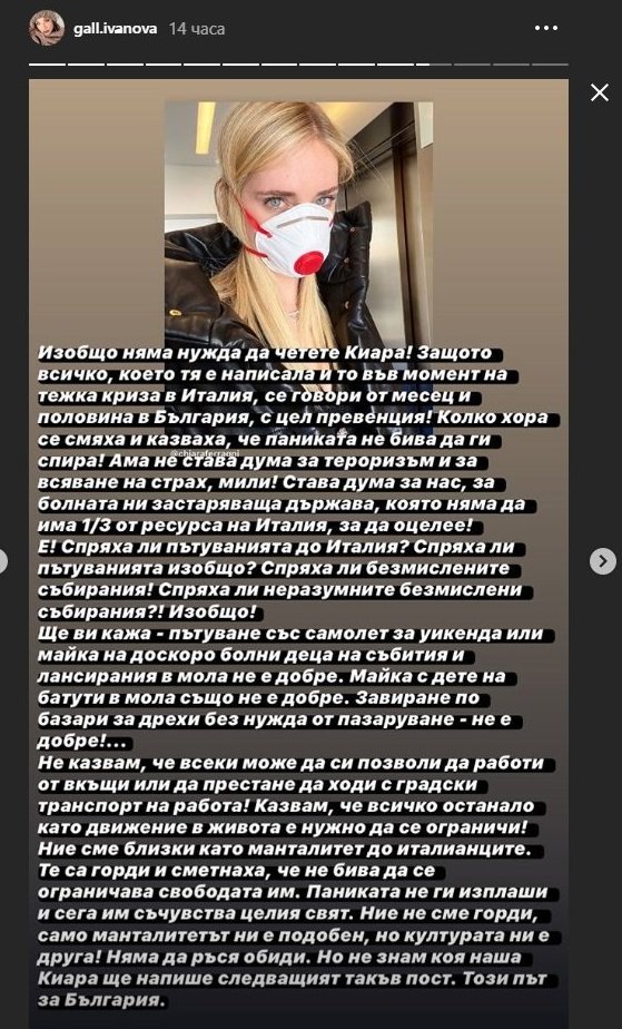 Доста инфлуенсъри пуснаха сторита за коронавируса, най-вече за превенцията. Мисля, че това е достатъчно. Нямаме нужда и от това да “разбират” и да раздават акъл както само те си могат.