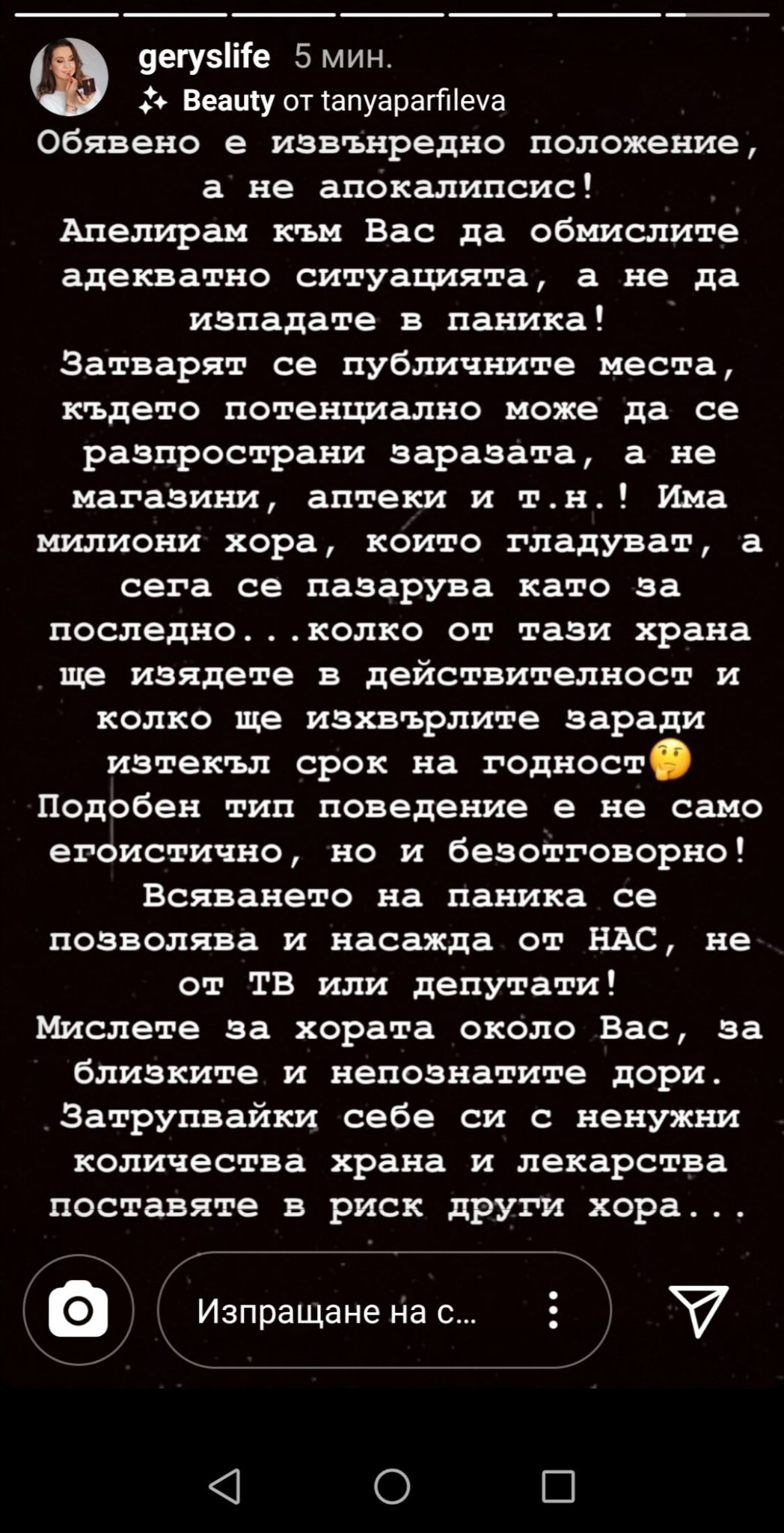 Безотговорно и глупаво, но говори за милиони гладуващи и ни апелира. Да си гледа оригиналното Гучи и да не се изказва по важни теми.