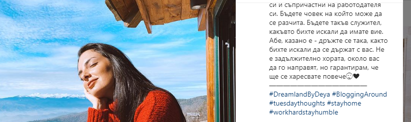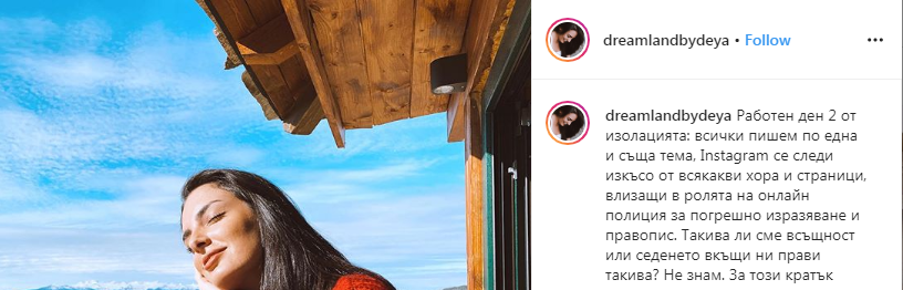Дея я мернах в любимото списание Биограф, по повод рубриката й. В единия брой хвалеше Меркари и ми стана много смешно, но я последвах в иг. Симпатична и скромна ми се стори. След тази тъпотия ще я отследвам. Самочувствието явно и на нея й е повече, след като вместо да се извини и да си вземе бележка, се прави на интересна. Бих писала на списанието, защото те са много отговорни към аудиторията си хора и не съм убедена, че ще се съгласят с подценяването на правописа, което демонстрира, както и с виренето на нос. Подозирам обаче, че е възможно да поддържа социалните ми мрежи, затова вероятно няма смисъл. Жалко. Изяви се като поредната надута кифла, дето е над нещата.