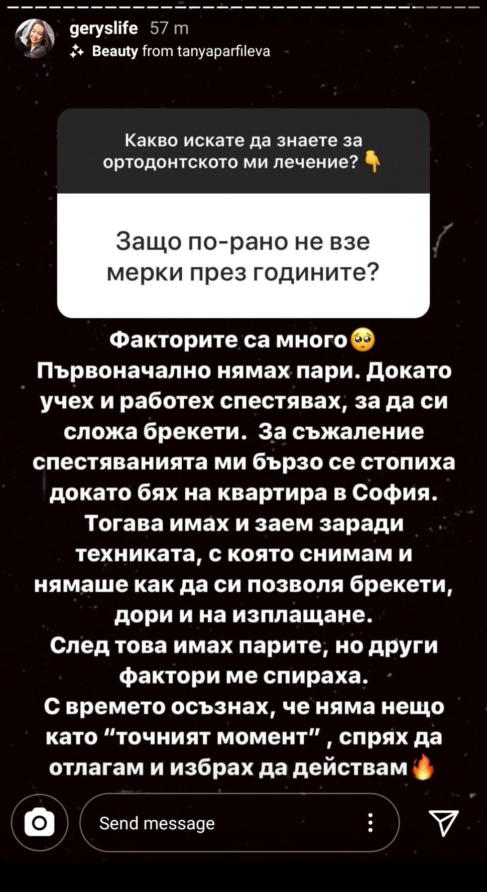 Оправдания са това на Гергана. На дъщеря ми сложихме брекети преди 8 месеца, повечето ортодонти приемат разсрочено плащане като вноската е сигурно 1/3та от стойността на чантите ѝ скъпите ѝ парцалки.