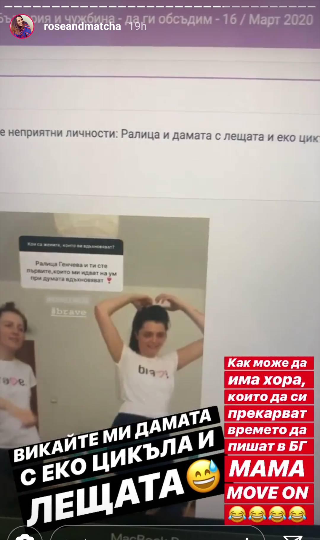 О! Така било значи. Да й отдадем чест на псевдофеминизма. "Феминистката", която оплю в стори жените,част от най-голямата българска платформа за подкрепа и обмяна на опит между жени. Платформа, дала началото на не една инициатива и организация в подкрепа на жените, платформа "инфлуенсваща" на бюти, мами и лЯйфстайл теми, много преди ИГ да се появи и да монетизира свободното споделяне на опит. Ама разбира се, поклон пред тази велика българка, която се засяга,че някой я е споменал във връзка с (О, чудо!) собственото й описание в инстаграм - еко цикъл.