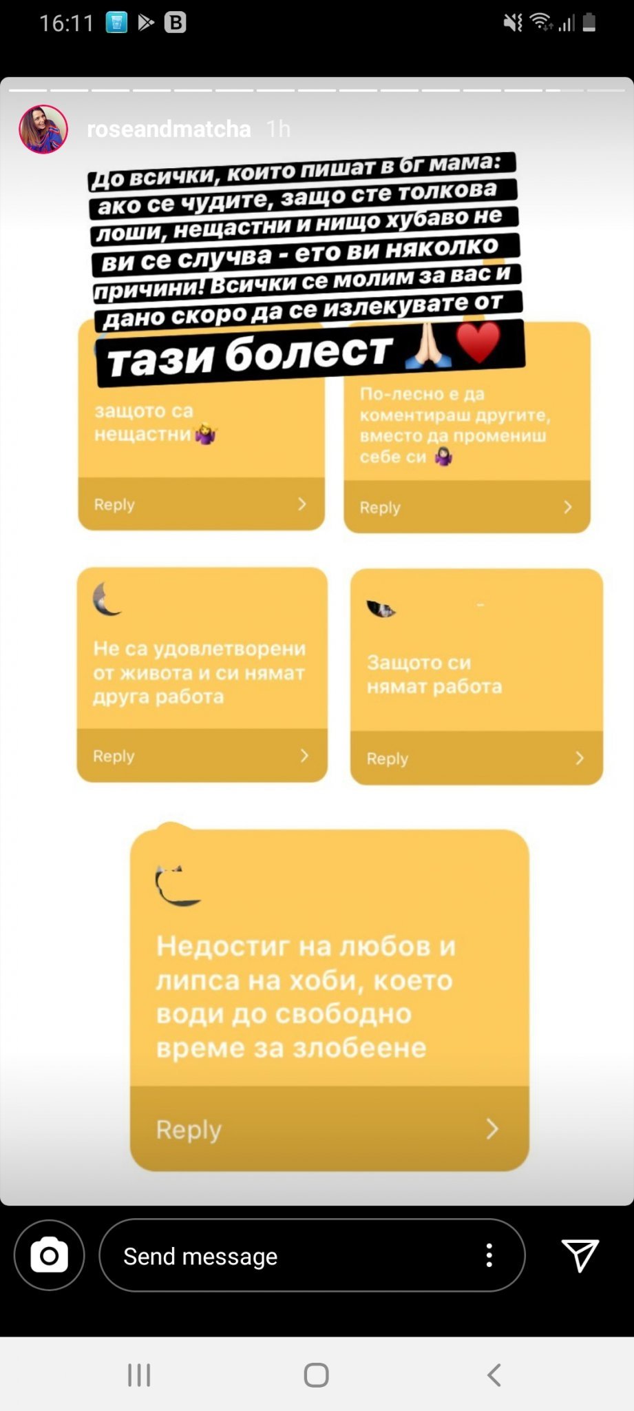 Тази с лещата изтри сторито за нас от страх сигурно🤣. Смешница.