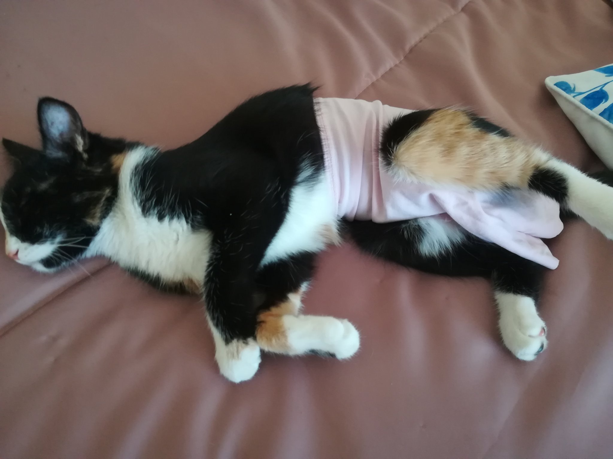 Yellow girl, това, което си сложила на котката, тя може да го свали през нощта, и да си разшие раната. Аз ти предлагам вариант на боди, изрязано от чорап, не е трудно да се направи, а оставя задната част на телцето на котето открита, за да може да ползва тоалетната: