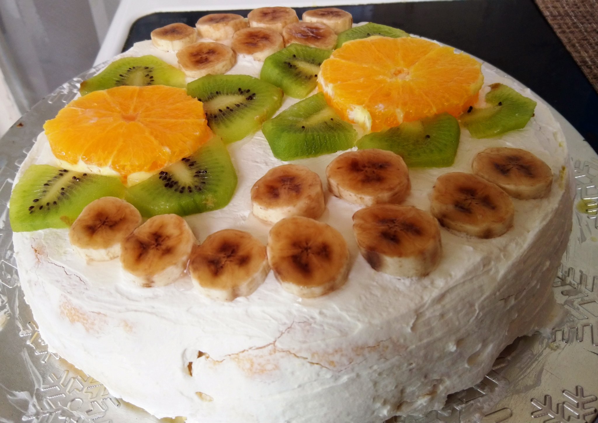 Сметанова торта с пандишпанови блатове, плодове и сладко от праскови.