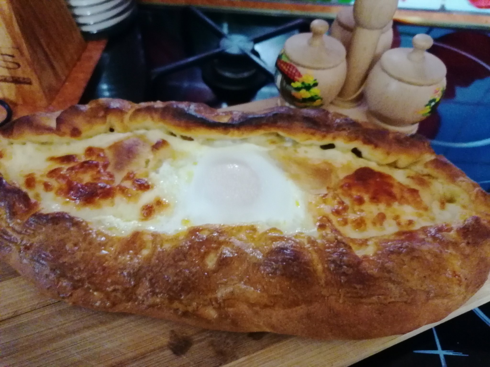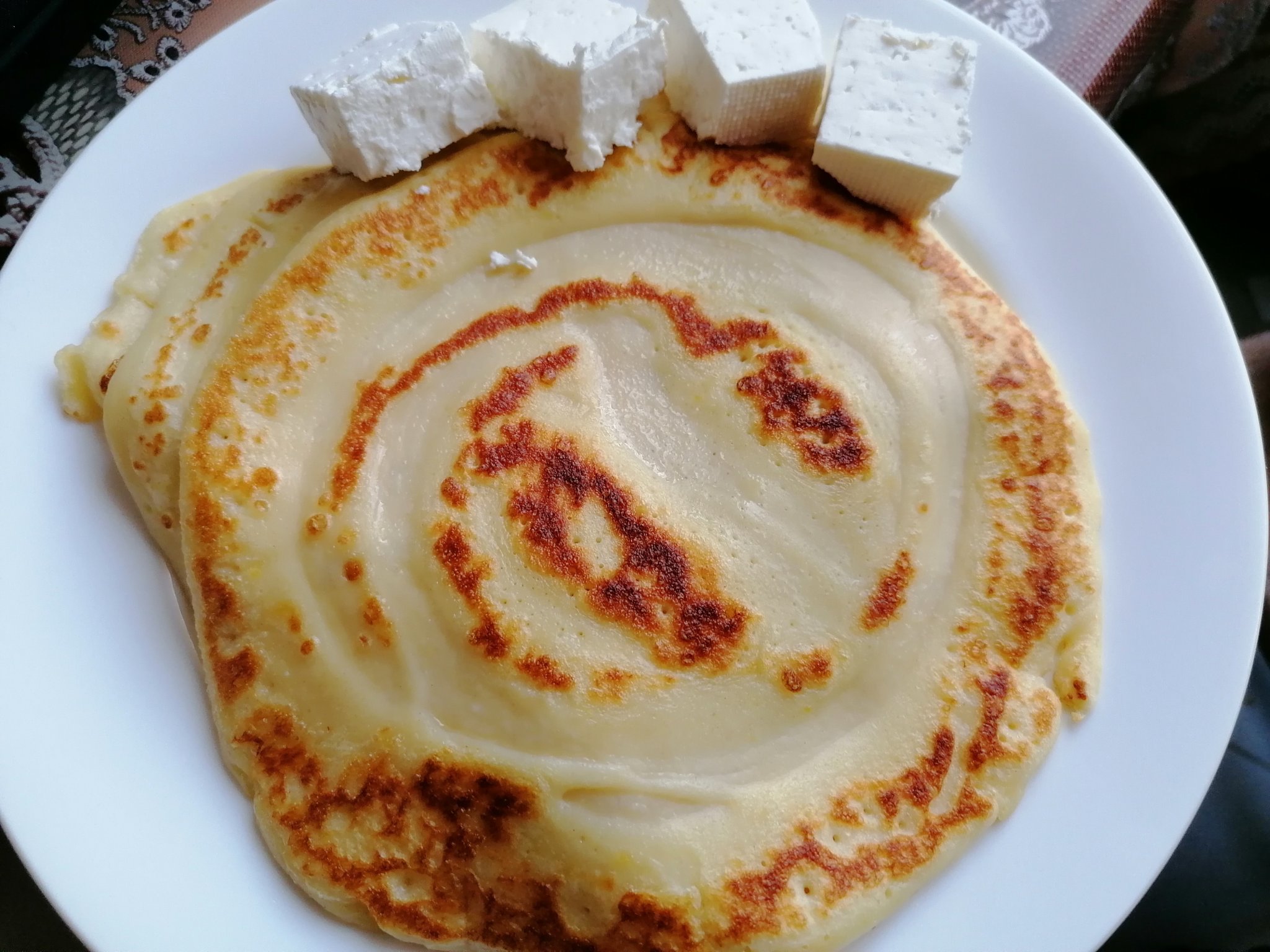 Намазва се тава с олио и се сгорещява във фурната.След като се извади тавата,се натрошава сирене,да покрие дъното на тавата.Залива се със смес от 5-6 яйца и литър и половина прясно мляко.Пече се на 160 градуса