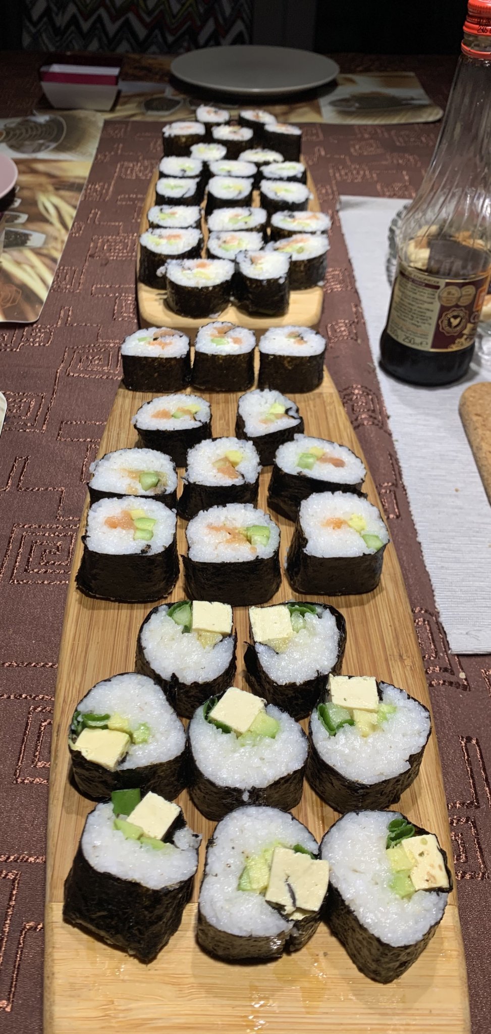 На преден план на сушито е едно експериментално / побългарено/ със зелен лук и мариновано тофу