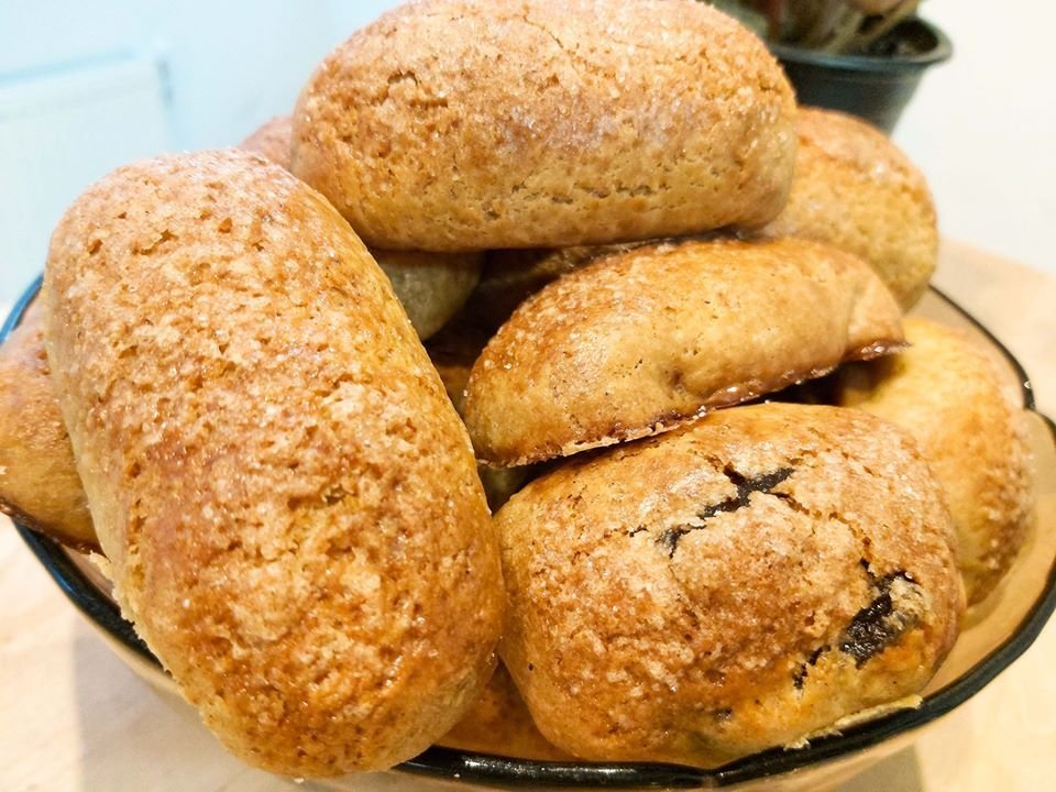 Пресявам брашното с бакпулвера канелата и ванилията в дълбока купа. В друга разбивам яйцата, киселото мляко със содата, захарта и мазнината докато се разтвори захарта. Изсипвам при сухите съставки и омесвам меко тесто. Разточвам го на правоъгълник до дебелина около 0,5 см. И нарязвам на квадратчета и слагам по парченце мармалад. Завивам го хубаво на фунийка, като краищата подвивам надолу и притискам. Нареждам ги в тава, покрита с хартия за печене и ги намазвам с разбито яйце и прясно мляко. Ръся ги щедро със захар. Пека в предварително загрята фурна на 180 градуса за около 35 мин. Вадя ги и ги поръсвам с вода. Оставям за около 10 мин да се охладят в тавата и ги редя в купа.