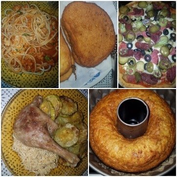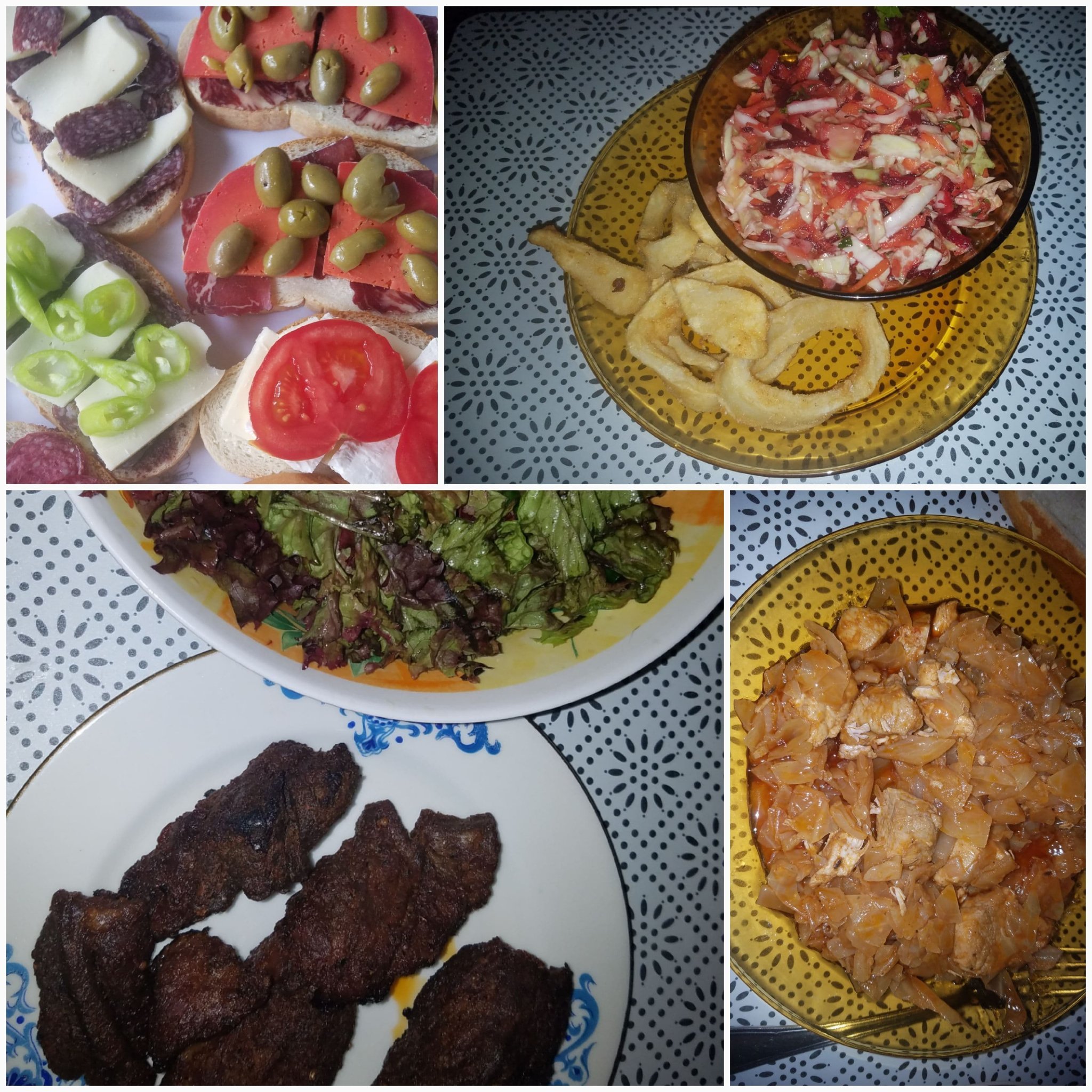 На мен ли ми се струва или напоследък има много повече постове ?! Simple Smile Все забравям да снимам или нарочно пропускам, че често повтарям някои неща, които са ни любими....А и няколко дни подред изобщо не ми вървеше в кухнята, все нещо прегаря или се разпада.....В два колажа представям една част от сготвеното: студени сандвичи, панирани ( от мен) калмари и зелева салата, мариновано говеждо на фурна със зелена салата, свинско със зеле; спагети Болонезе, пържени филийки, пица , патешко бутче с печени тиквички и нудълс, морковен кекс. Набелязах си много неща от последните...60-80 публикации Simple Smile Да видим само кога ще остане време.
