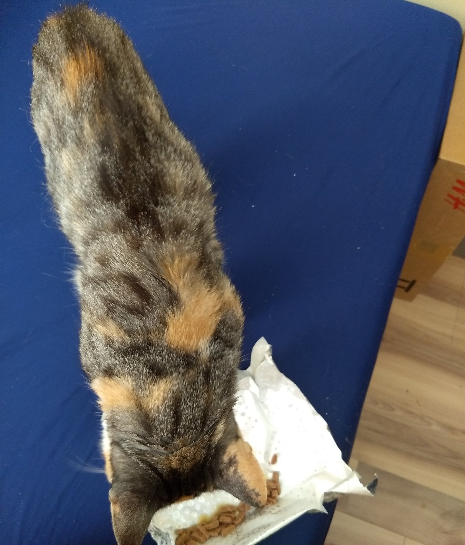 Опитах се да я снимам, но вече се е качила на тавана и не исках да я свалям. Отдясно е вдлъбнато, а отляво издадено. По принцип си е дунда, но на видеото преди да зумна накрая, мисля се вижда как шкембето ѝ се поклаща на ляво. Забравих и да спомена, че понякога при изправяне задните крака са малко нестабилни и поддават, като се изправи и тръгва уверено.