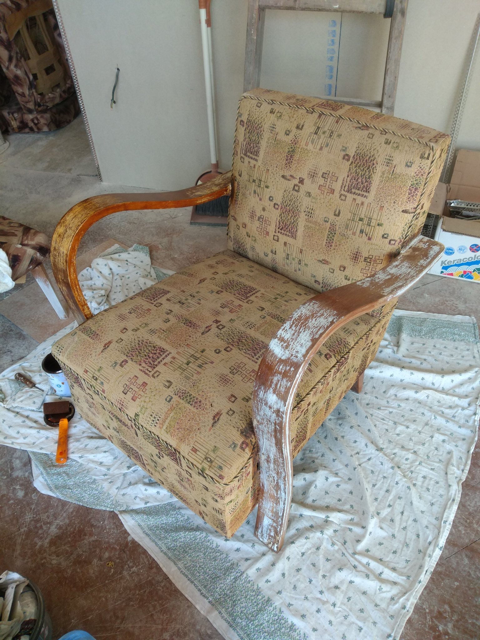 Диди, показвам ти, а и на всички първият претапициран фотьойл. Поне 40 годишен е. От него е извадено абсолютно всичко съдържимо (конопени колани, пирони и слама) без пружините. Сложиха нови колани, дунапрен, подложки и тапицерия, която съм подбрала съобразно другите цветове. Ще се използва за гледане на ТВ във втора спалня (детска). На подлакътниците лично съм свалила стария лак с пистолет за горещ въздух, шкурене, лак, шкурене лак. Много удобна мебел, със сигурност го знам, защото втория такъв е вкъщи, претапициран преди 10 години.