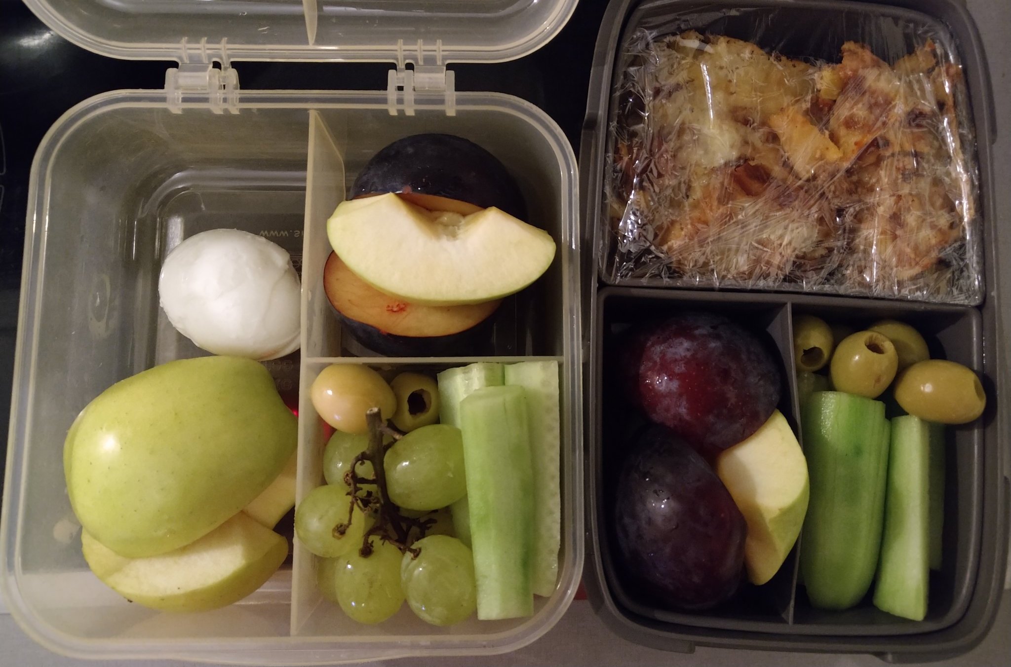 Към сивата кутия има и още една с ябълка и яйце.