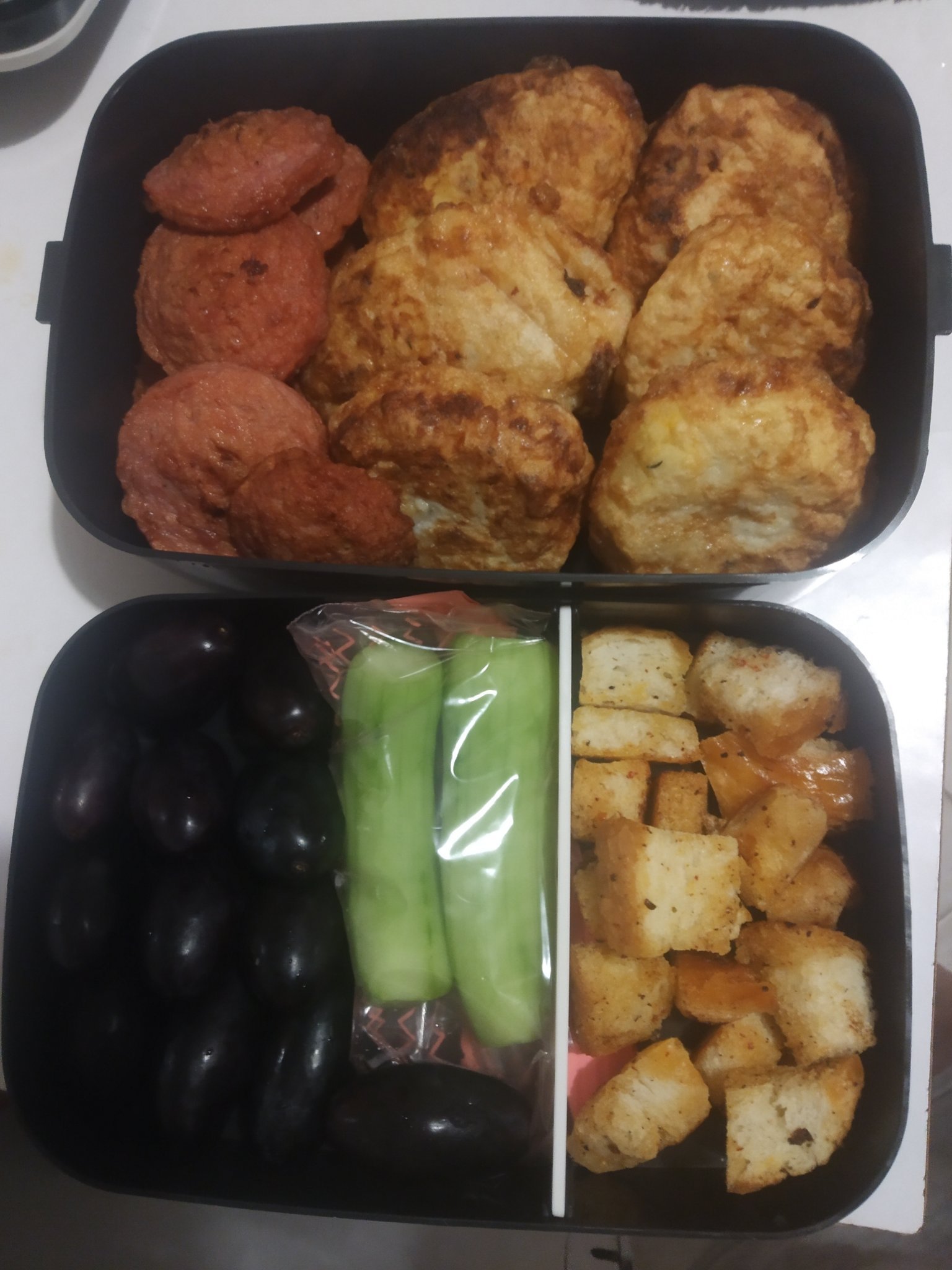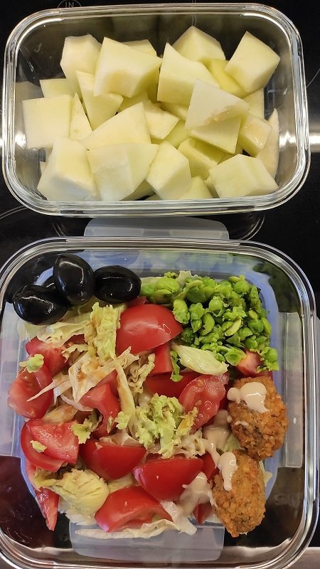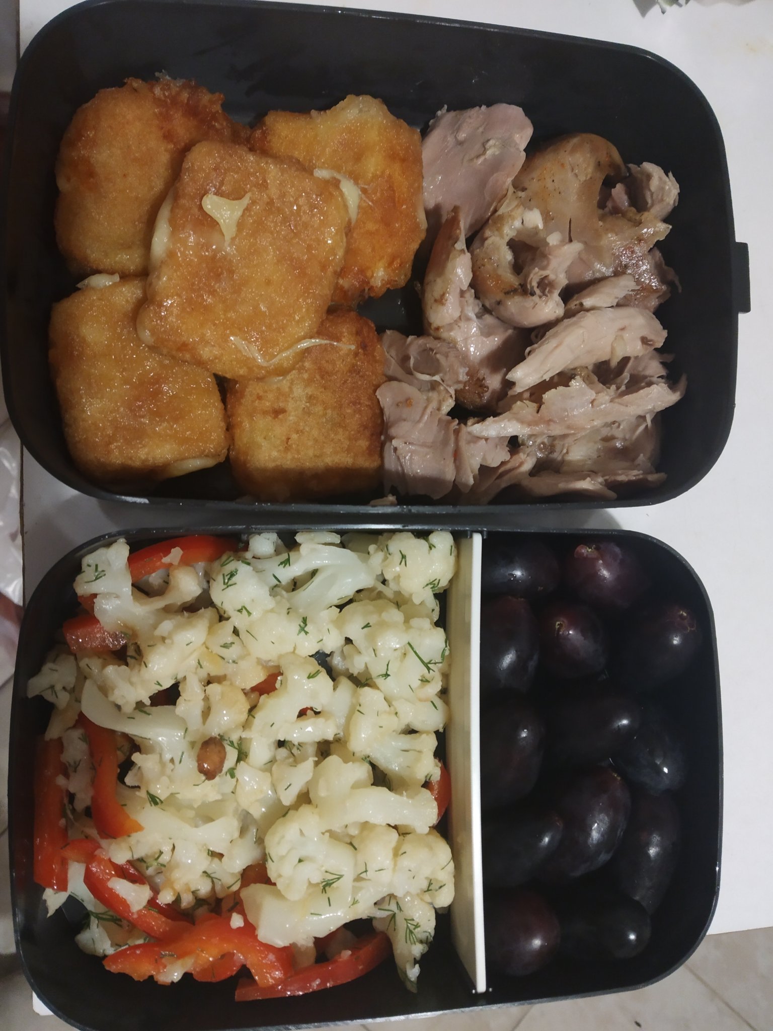 домати, маслини, ябълка и сливи. Днес само плодове си взе - грозде и боровинки, че след часовете е на РД и ще има почерпка