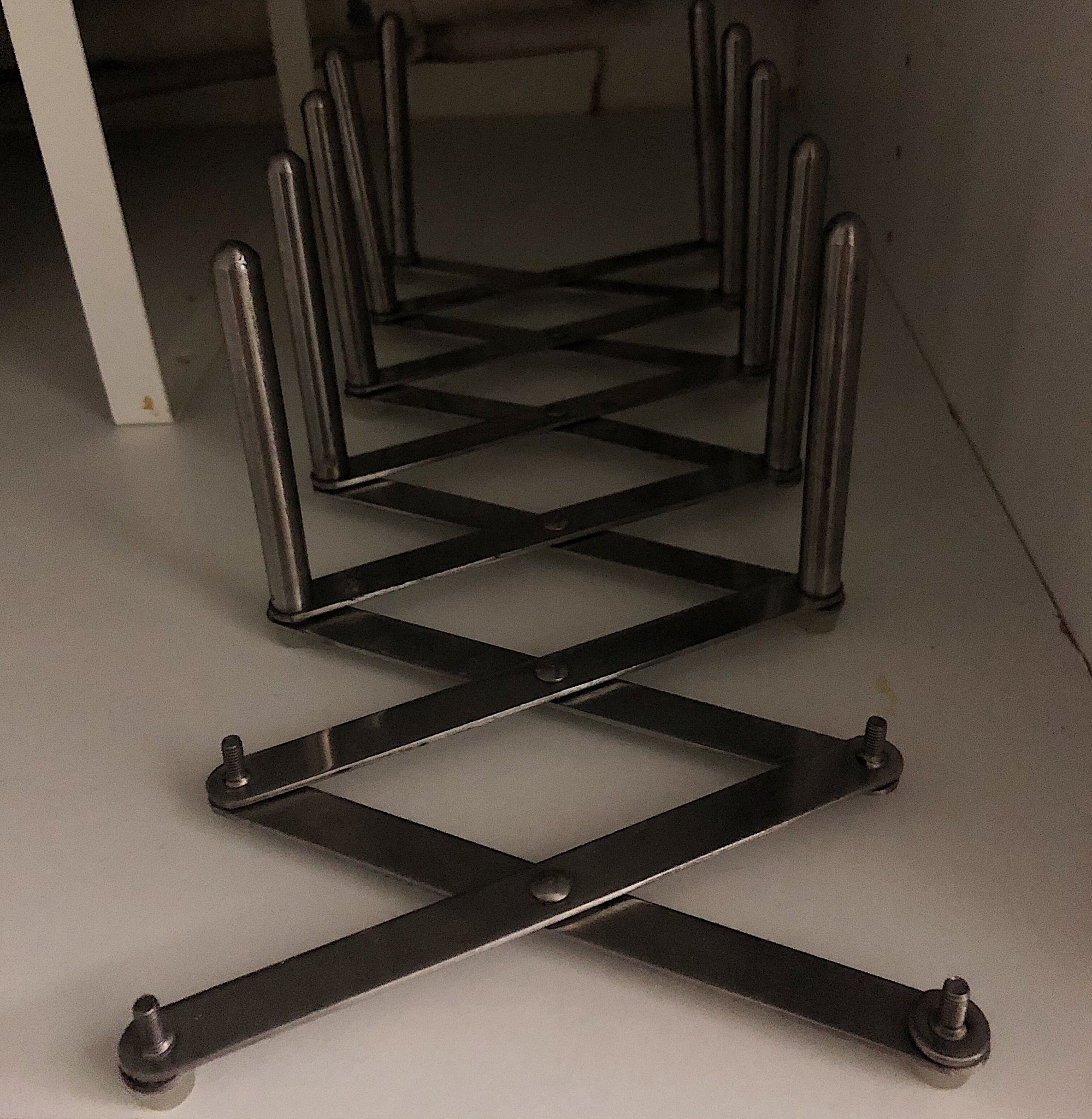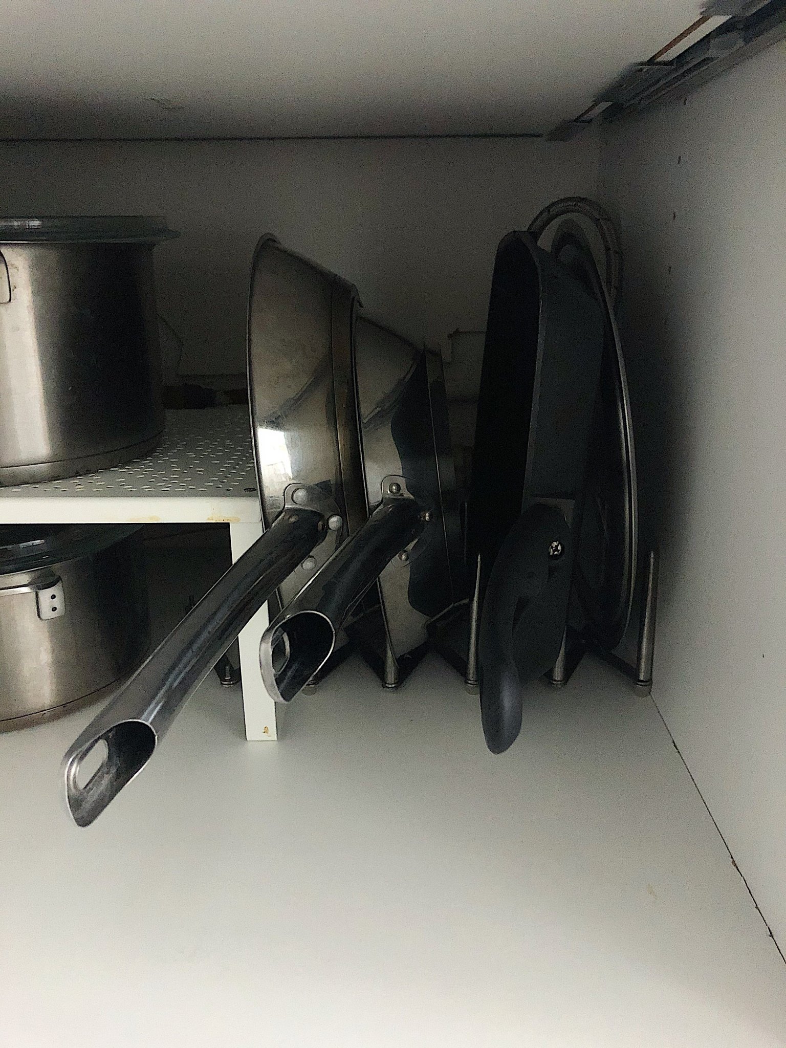 Аз си държа тиганите прави в един метален разделител от Икеа. Така не се притеснявам, че тефлоновото покритие ще се нарани, както, ако са един в друг. Предпочитам го пред подобен на показания механизъм, защото, ако реша да пренаредя шкафовете, ще ми е по-лесно.