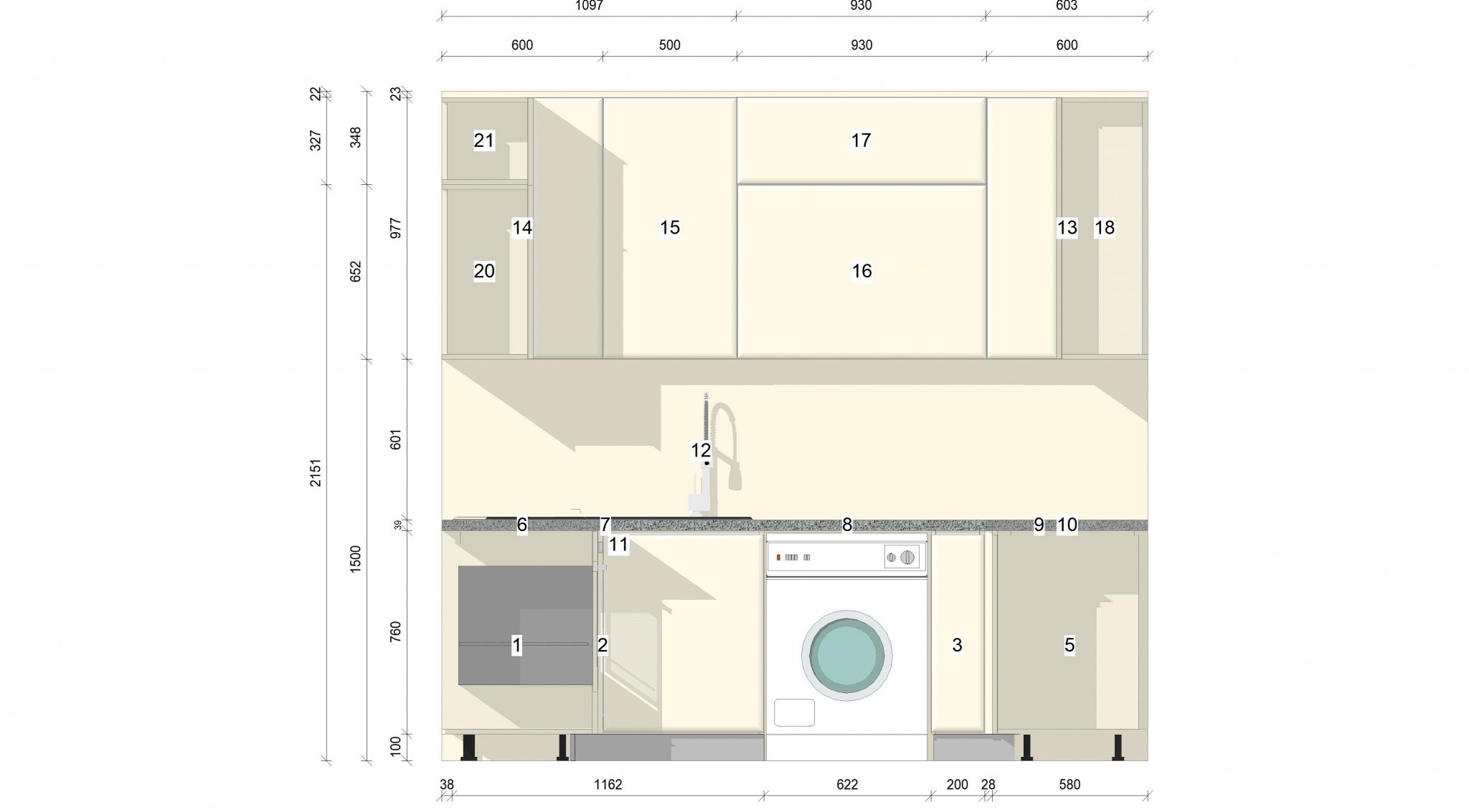 Конфигурацията е - шкаф с чекмеджета, вградена фурна и котлон, ъглов плот без шкаф под него, мивка, шкаф с бутилиера, свободностояща миялна, хладилник. Искаше ми се мивката да е бордова, но не мисля, че ще е удачно. Ще има и горни шкафове, но не съм ги добавила още: