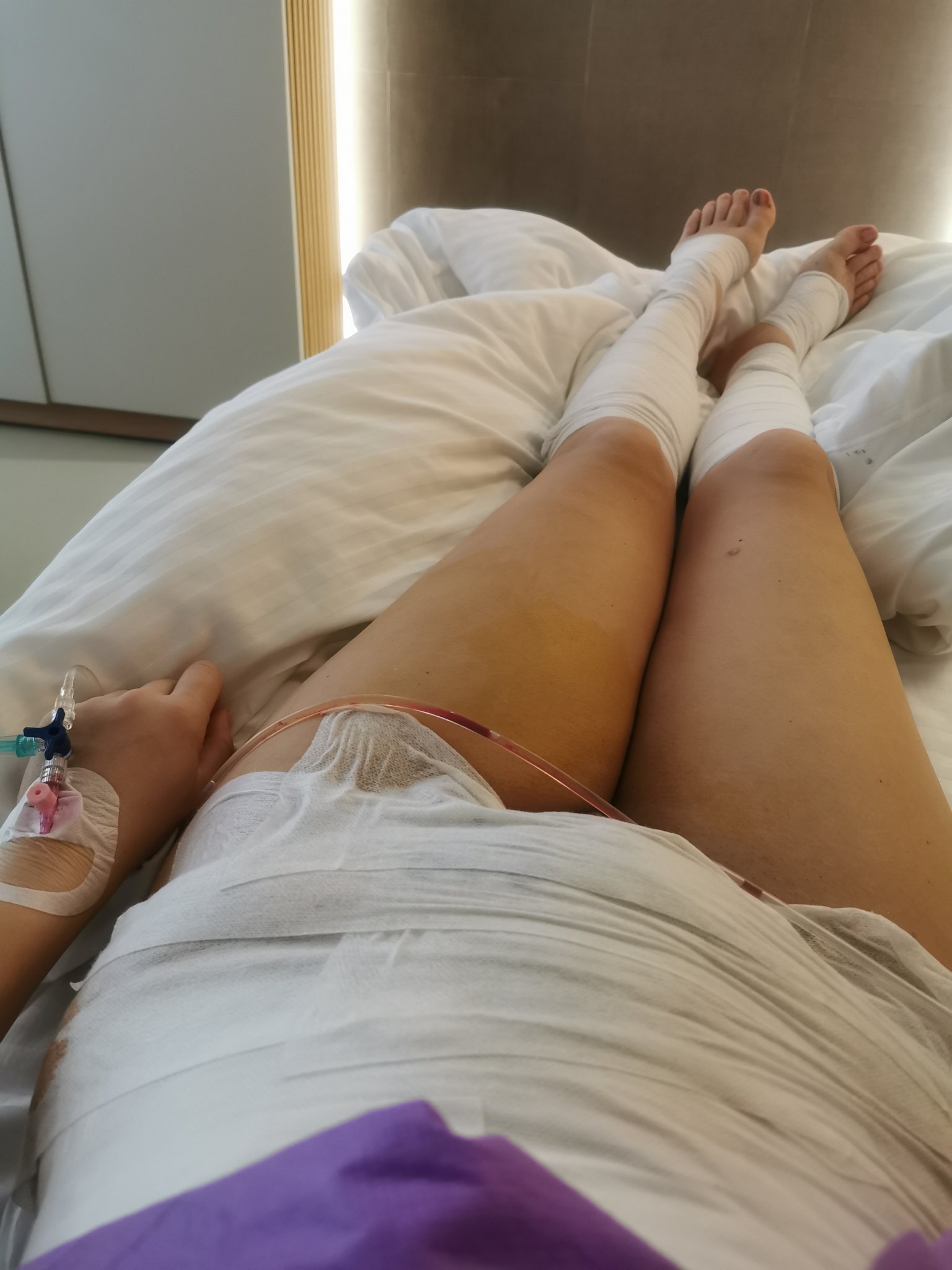 Бинтована съм под колената със силно стягащ ластичен бинт, превантивно да не слезе някой тромб във вените от операцията. На доста места увиват така краката или слагат ластипни чорапи при всякакви операции.