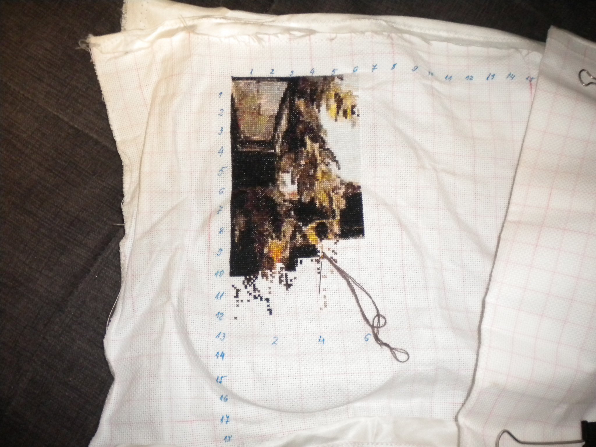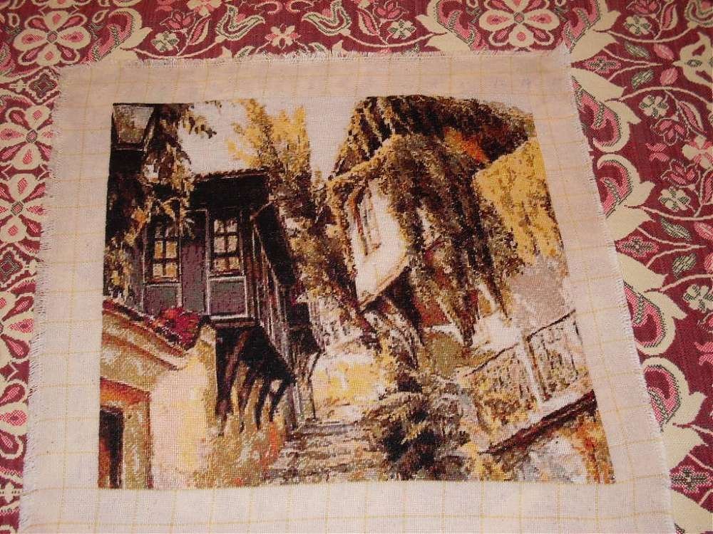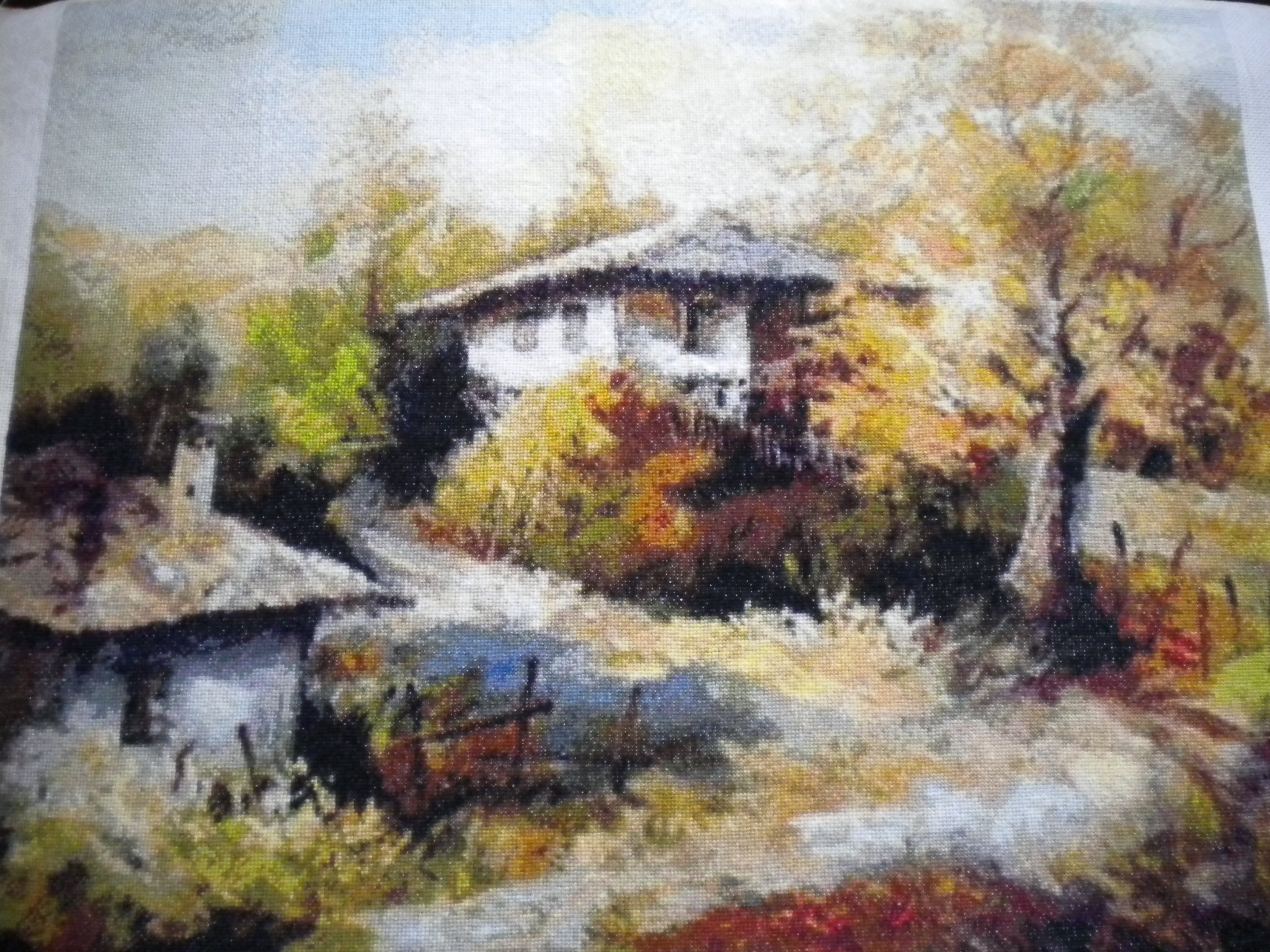 Относно сегашното начинание - мисля, че не трябва да се отказваш. Хванала си да го шиеш от тъмен ъгъл... После ще ти просветлее, предполагам. Като гледам, с моите ужасно ограничени познания в гобленарството, най-тъмното в картинката ти е този ъгъл и къщата под него...