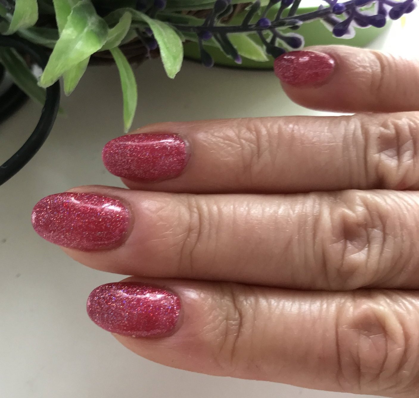 Изкарах една седмица без лак, че много работа покрай дистанционното обучение... Сега реших да се наглася Blush Комилфо D078... Много интерен цвят... тъмна сьомга май го определям... Но сгреших като сложих брокат...