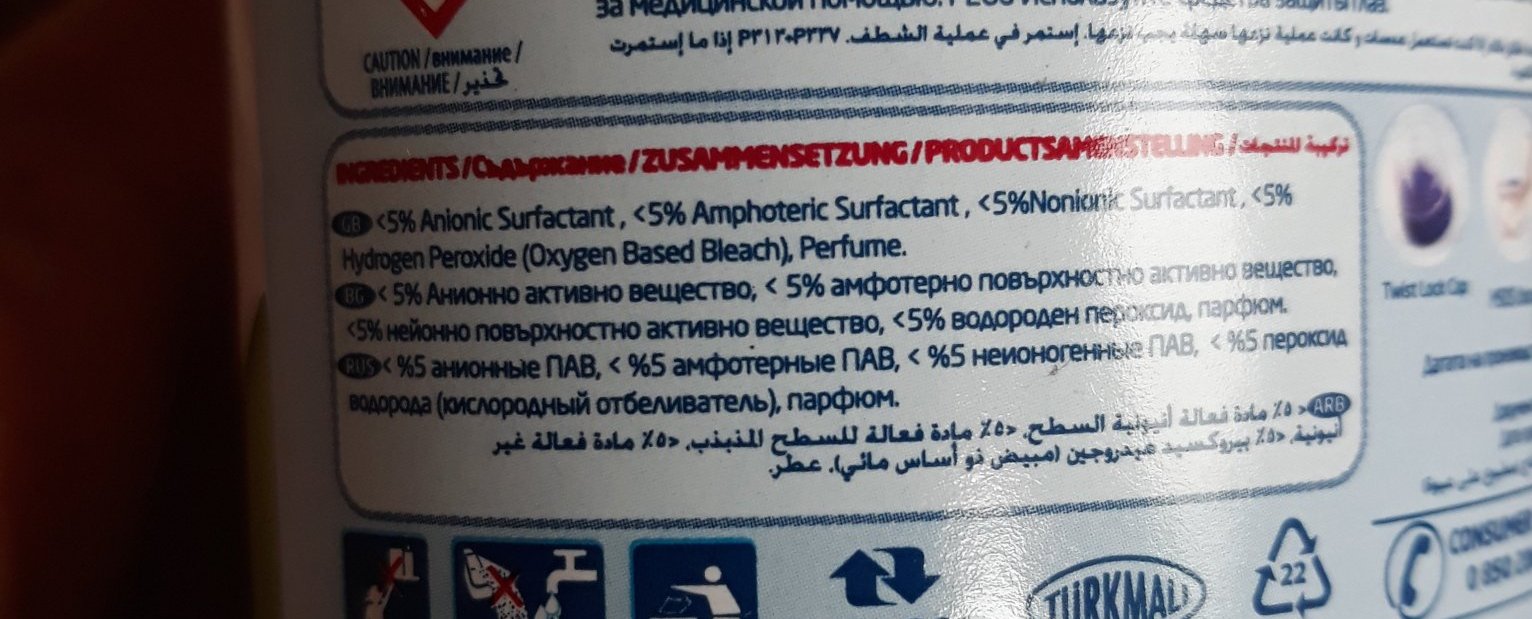 Спирт-етилов алкохол над 60%(силна ракия), белина, пероксиди(перхидрол), препарати за баня-амониеви(почти всички), препарати срещу мухъл(изключително бързо действие) и още доста битова химия.