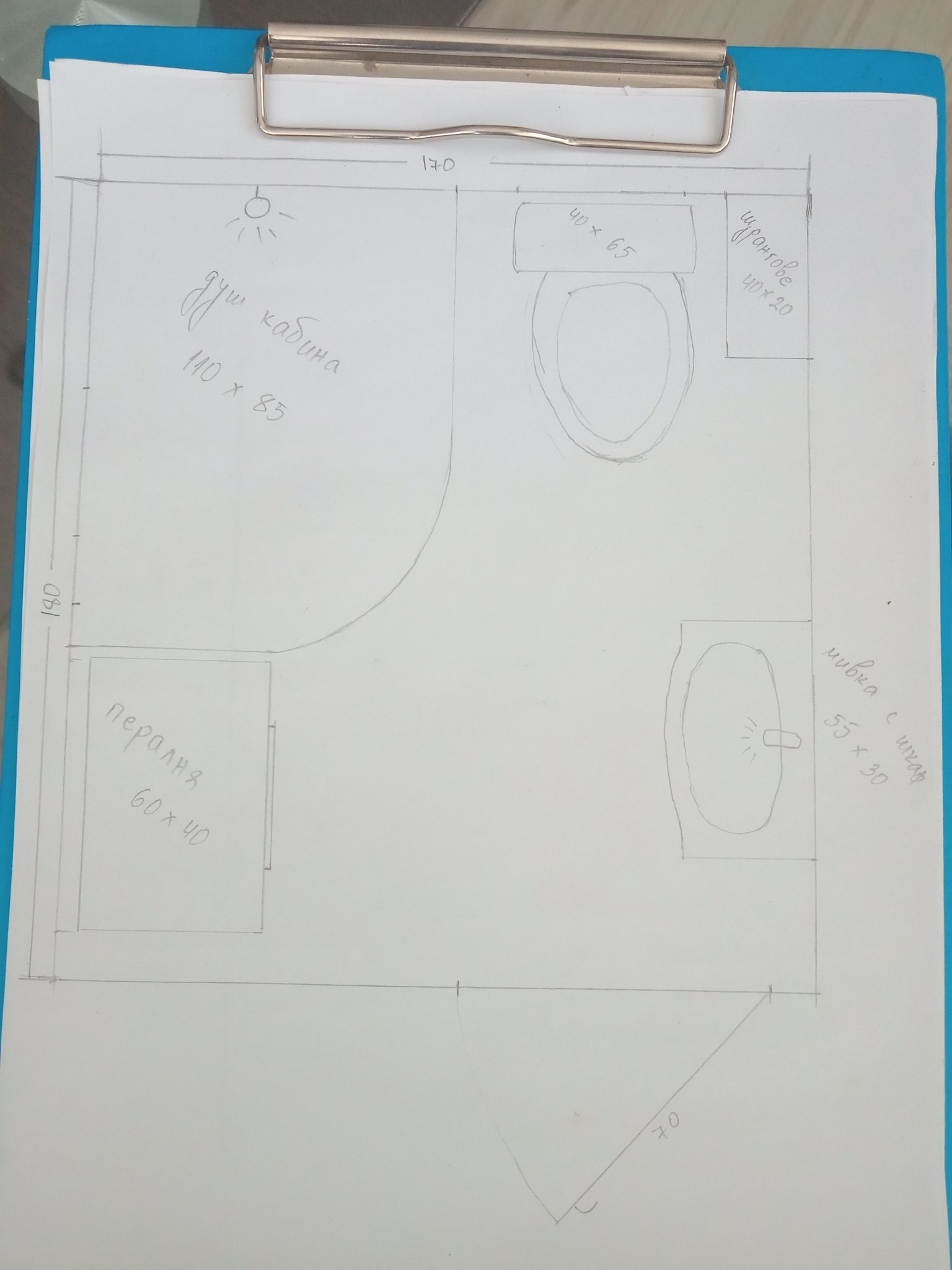 Ето набързо една скица, в мажаб 1:10. Банята е 2.98 кв.м. НС около 5 -6 годишно. Бойлерът е вертикален, над тоалетната и изобщо не пречи. Има голямо огледало, заемащо почти цялата стена зад мивката. Има и дълъг тесен шкаф над вратата, по протежението на цялата стена. Пералнята е малка, но и апартаментът е малък и за двама души преспокойно стига, 5 кг е. До миналата година бяхме с голяма пералня 8 кг, но се развали. И с нея пак имаше достатъчно място.