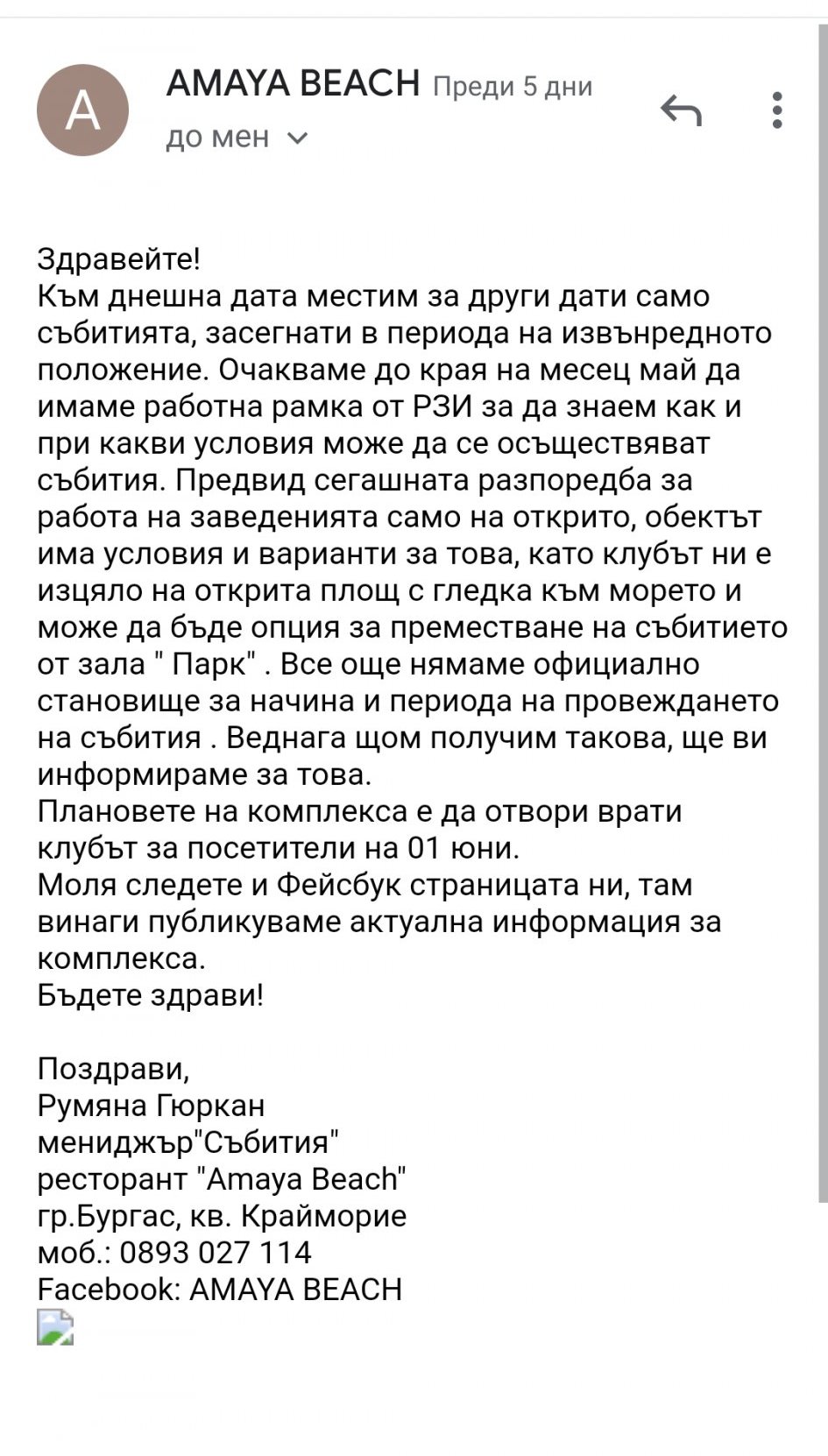 Аз съм от Бургас, но от заведението нищо не са казали. Онзи ден си писах с тях и казаха, че за сега а отменили само сватби до 13 май. Имало възможност да направим сватбата в клуба им/ако се наложи/. Това мен не ми харесва, първо, защото в съседната зала има още една сватба. Как ще се реши коя от двете двойки да вземе клуба? Второ, не го харесвам, има басейн, огромна сцена и всичко е  на сепарета.. Предпочитам в градината на наща зала. Както и да е. Казаха, че ако има промени ще ни уведомят  да следим страницата им във фб. Все пак смятам юни месец пак да ги прослушам, така или иначе трябва да уточняваме менюта.