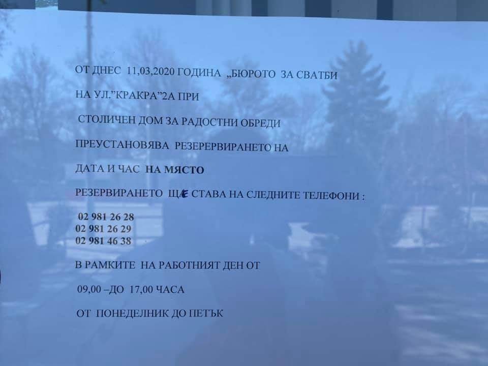 Палечка, в събота (ако съм разбрала правилно) няма кой да ти вдигне телефона. Хората всъщност са си на работа. Аз ходих в петък да си дам документите на ул. Кракра (до първа английска). Всъщност се оказа, че е трябвало да отида до залата на Витошка, но ще отида в понеделник там. Иначе на ул  Кракра имаше наистина залепена бележка, която ще публикувам тук. Оказа се, че за 20-ти март няма да се женим само ние, а има и още една двойка, която е в залата на Крака. Съобщението на стъклото казва, че може да се записва час за брак, но само по телефона.