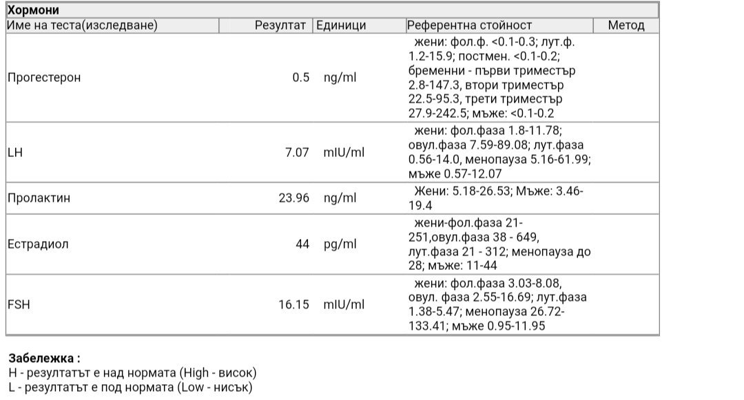 Здравейте, на 48 год. съм. Засега без значителни промени в цикъла.  Пуснах си изследвания, но гинекологът ми не работи в момента. Ще помоля да ми помогнете с разчитане на изследвания на хормони: щитовидна жлеза на чист ден от МЦ и FSH, LH и други на 4 ден от МЦ.