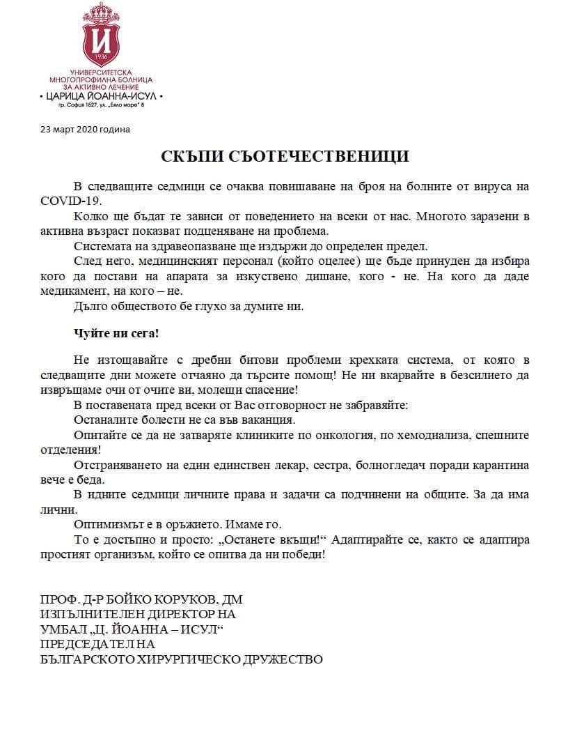 Обръщение на директора на болница ИСУЛ към обществеността: