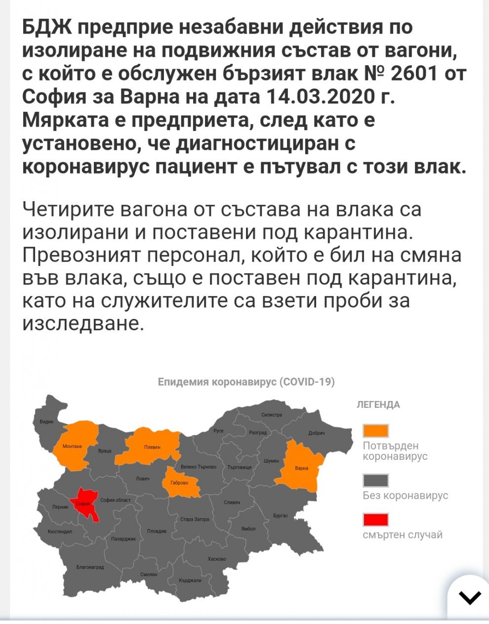 БДЖ предприе незабавни действия по изолиране на подвижния състав от вагони, с който е обслужен бързият влак № 2601 от София за Варна на дата 14.03.2020 г. Мярката е предприета, след като е установено, че диагностициран с коронавирус пациент е пътувал с този влак.