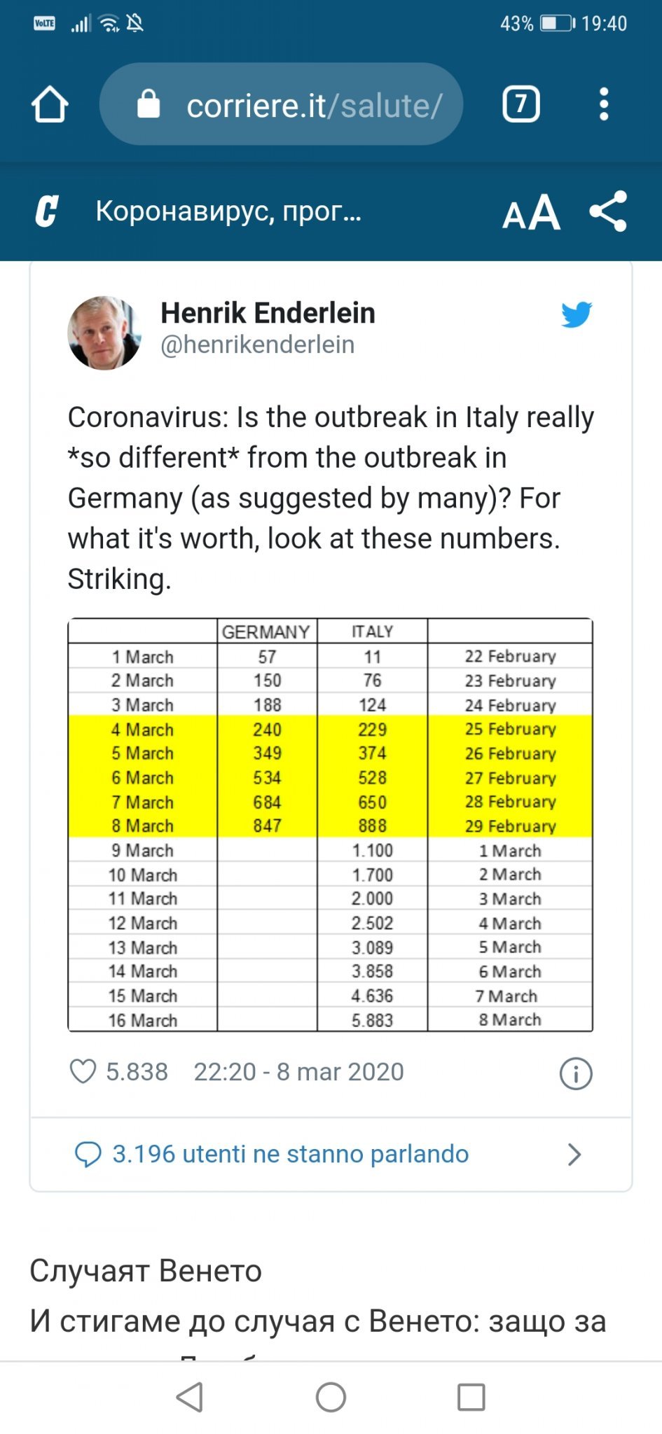 На 8-ми март бяхте с около 500 случая, а сега почти 14 000. Още преди 5-ми март, като гледах здравния министър на Испания, който обясняваше, че нямало да затварят училищата, в които вече има коронавирус, защото "те децата, виждате, са се заразили вкъщи", като каза, че няма страшно и няма отмени тържествата за 8-ми март, а после и краското семейство тръбеше как на 9-ти принцесите ще отидат на училище, макар и там да има случай, някак ми беше ясно какво ще стане. Много, много глупава работа. Обичам Испания и ми се къса сърцето всички, които сте там. Кураж!