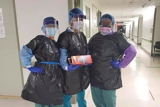 Медицински персонал в Ню Йорк импровизира защитни облекла от чували за боклук . Sad