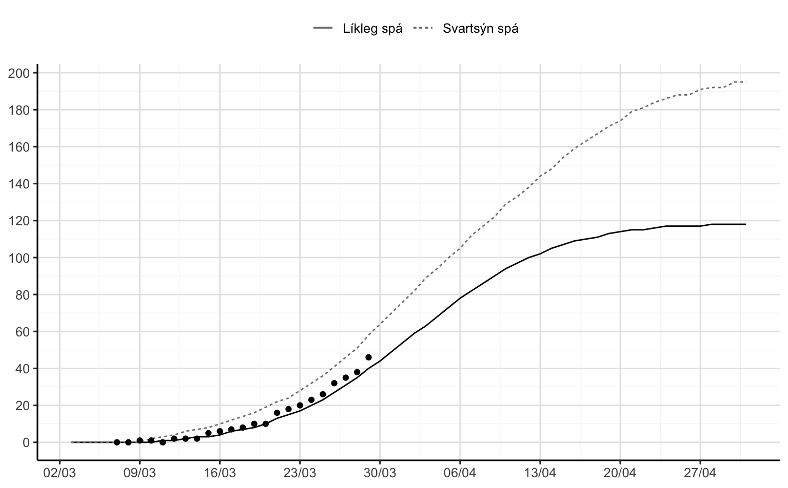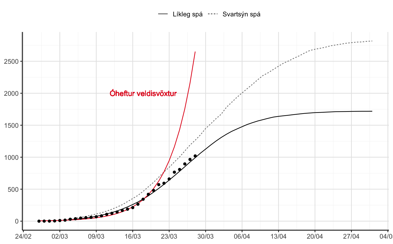 Мнозинството случаи се откриват чрез здравната система, т.е. тестване на симптоматични, с PCR тестове. Масовото тестване (deCode), пак с PCR, сред несимптоматичните (или с леки симптоми), които не са в карантина, продължава да открива сравнително малък процент заразаени - малко под 1%. Много се набляга, споменах по-рано, на това колко важно е ефективното проследяване на контактите на заразазените и възможно най-бързото им поставяне под карантина. Чакаме апп-а, за проследяване на движенията на хората, за който също писах преди. Здравната система се подготвя за момента, когато ще започне най-тежкото, ръководейки се от песимистичната прогноза.