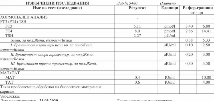 Привет мили момичета! Отново Аз и моите терзания.... ТСХ в петък ми излезна 3.37, а в събота, ето вижте сами резултатите... изцяло съм объркана и не знам сега да предприемам ли нещо и какво? Моля за съвет.... Благодаря ви! Да отбележа, че са правени на гладно и в една и съща лаборатория, но това разминаване просто ме застреля!