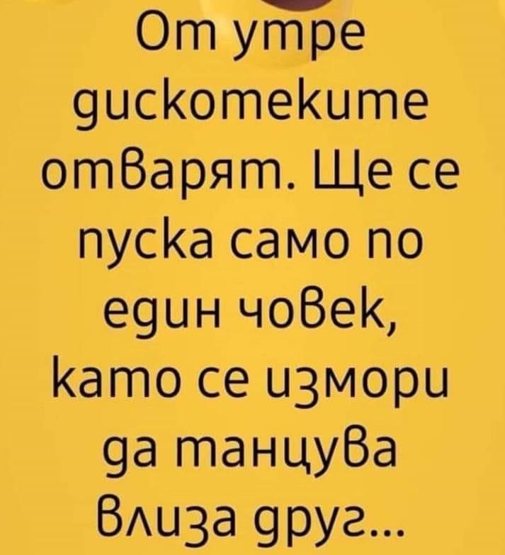А инак, оплаках се даже тук на една съфорумка, стадионът не работи! Жълти биляжки залепили по вратите и не щат да пускат хората да тичат за здраве! Разболяха ни зорлем, значи. Пак въртях педалите у нас, а искат като кобила да потичам навън на въздух, ма на - няма! Чакам да забранят движението по пътя и ще хукна там да тичам - хем равно, хем спокойно, хем за всеки желаещ ще си има отделно трасе, да се не цалуваме, дорде тичаме.