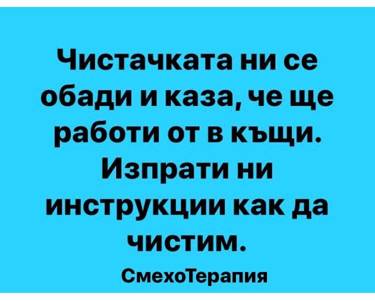 Аз съм в Плевен и тук още миналата седмица затвориха на детето яслата, а той отпреди това беше болен и си стояхме у дома. От вчера в работата въведоха хоум офис. Лично за мен е отвратително. Става още по-видно колко тъп и мързелив народ има и как може шеф на ТРЗ да плещи глупости. Сетила се Мара да се побара и цяла седмица след като пуснали хората се сетила да ме пита "ма не трябва ли някак да го оформим документално", щото тя отговаряла само да прати мейли на служителите. Тя не била юрист! Е, бива, бива...