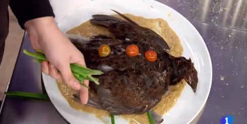 Сготвена е барабар с пера, клюн и т.н. или е сготвена, а  натуралистичните елементи са добавени допълнително?